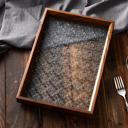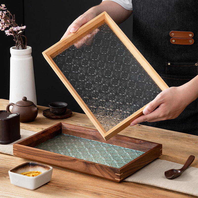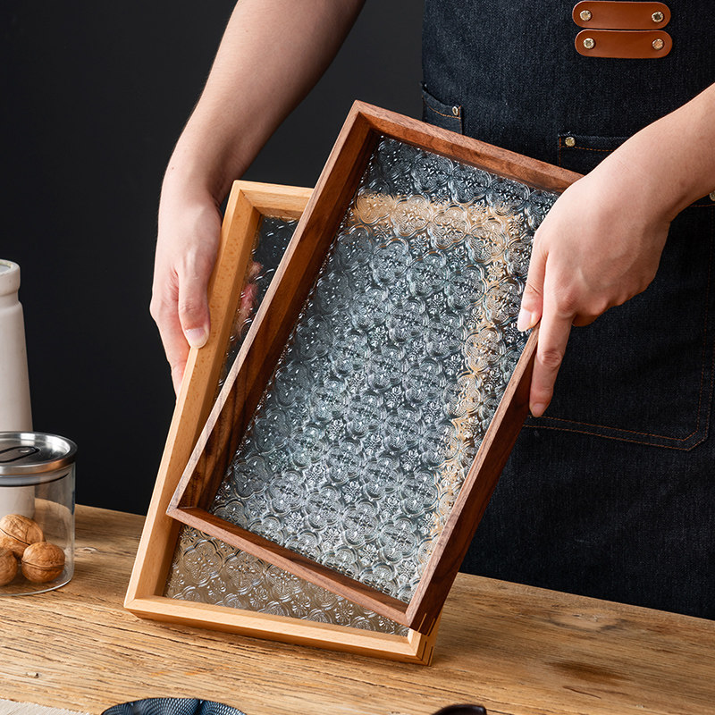 onlycook胡桃木玻璃托盘复古中式茶盘木质实木收纳盘零食盘子果盘