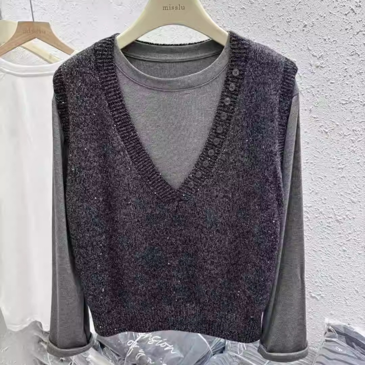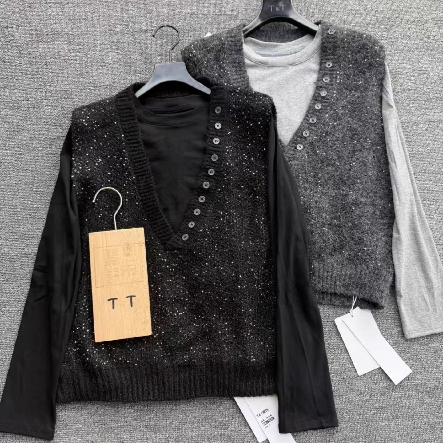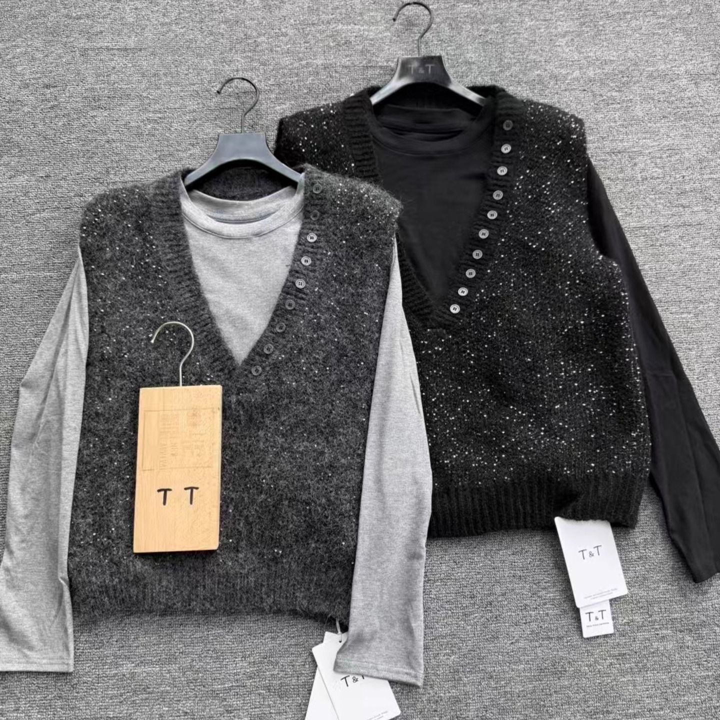 小香风时尚亮片V领纽扣针织马甲背心长袖T恤洋气减龄叠穿两件套女