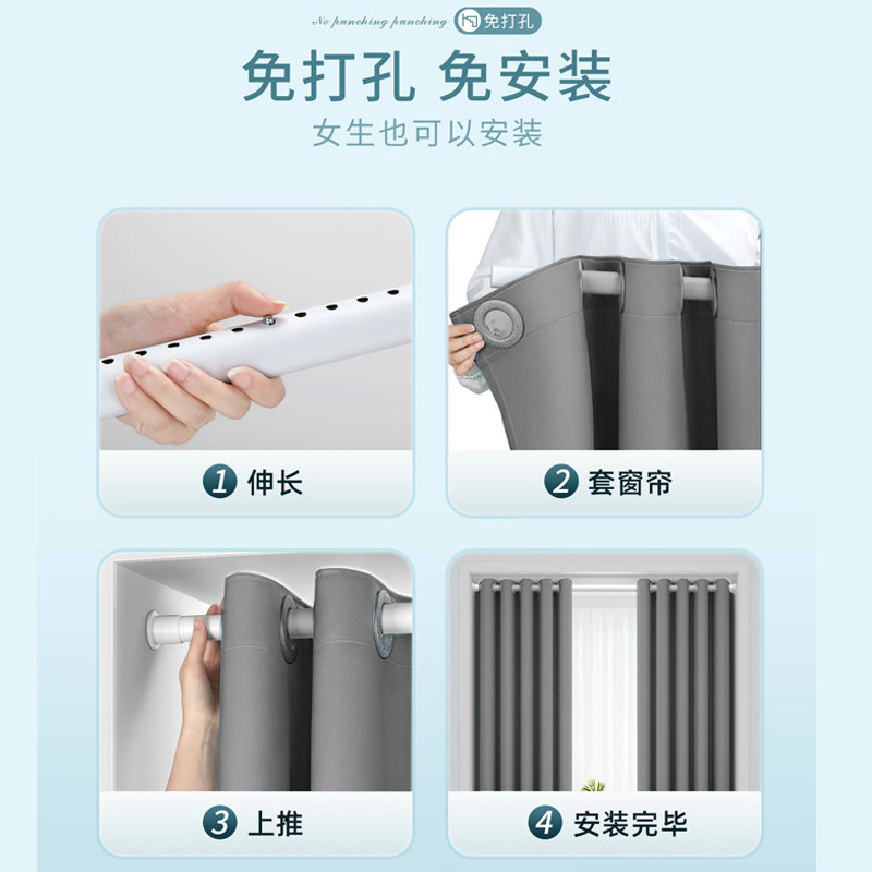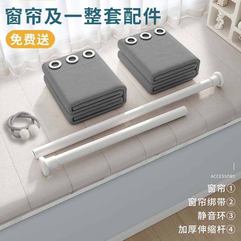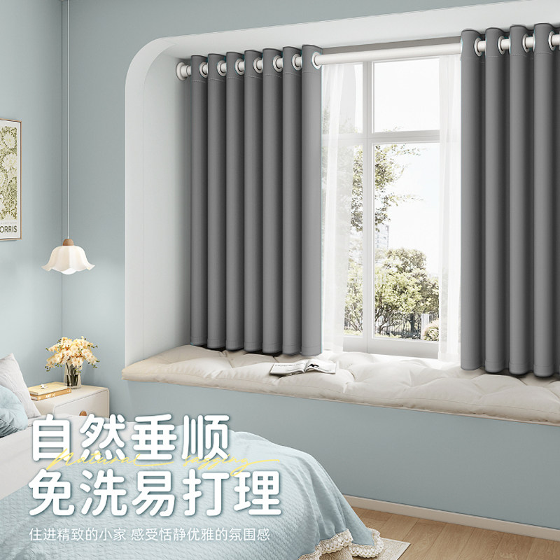 窗帘免打孔安装伸缩杆一整套卧室飘窗简约纯色遮光布简易短帘防晒