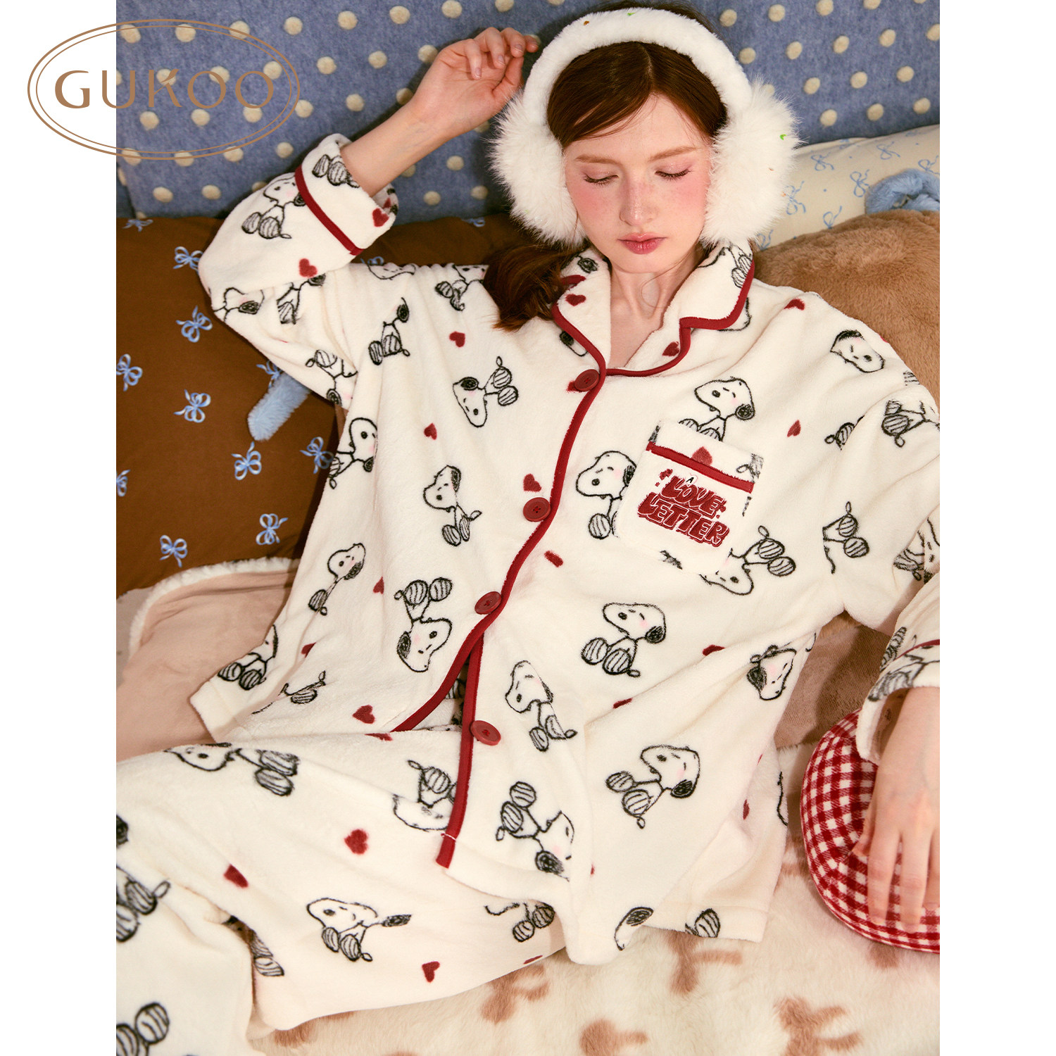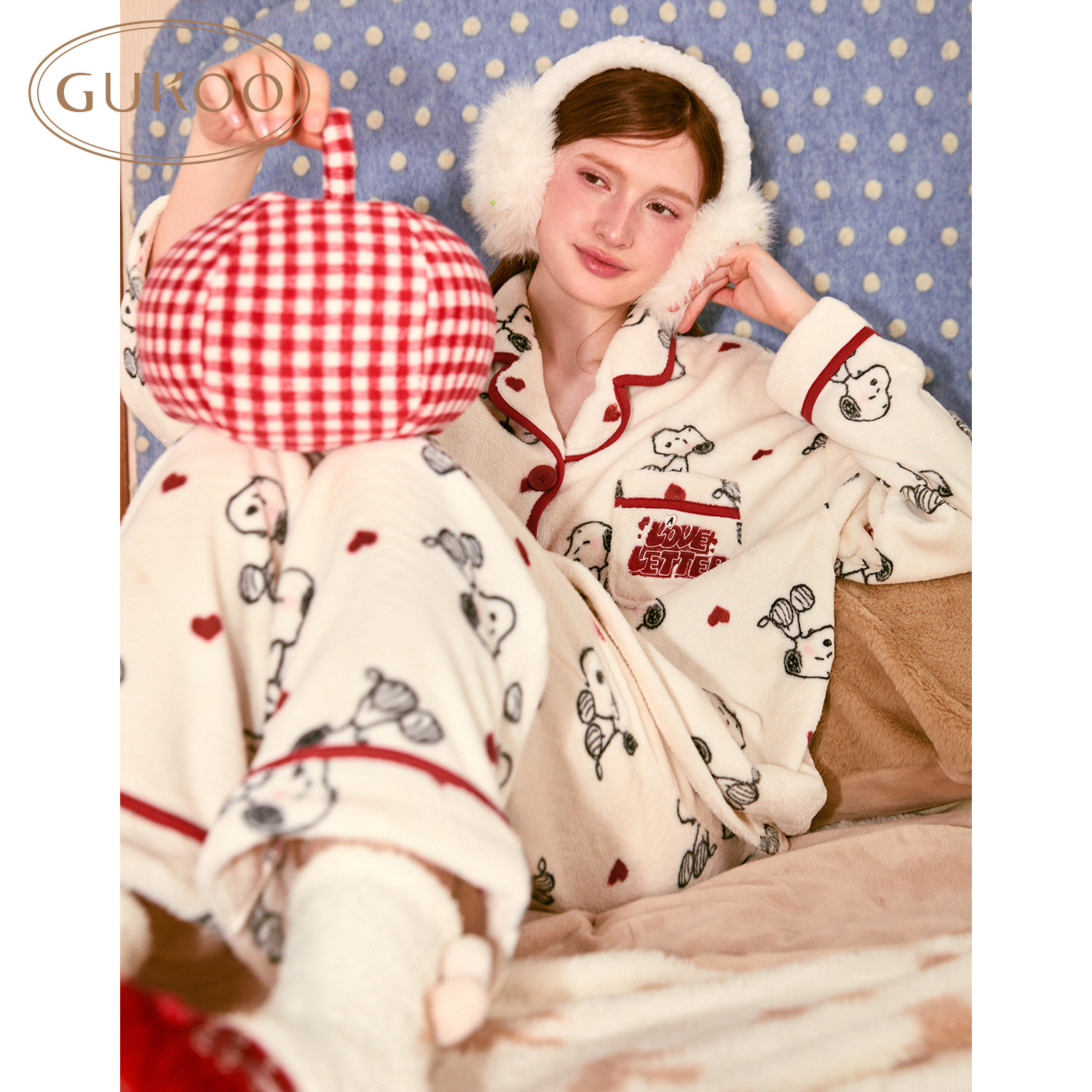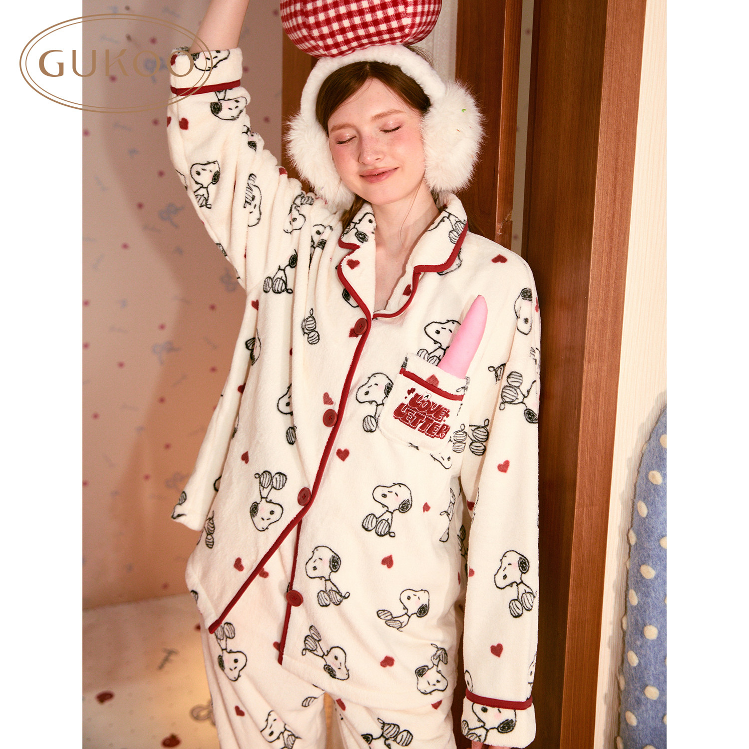 Gukoo/果壳睡衣女史努比珊瑚绒卡通印花可外穿保暖家居服套装