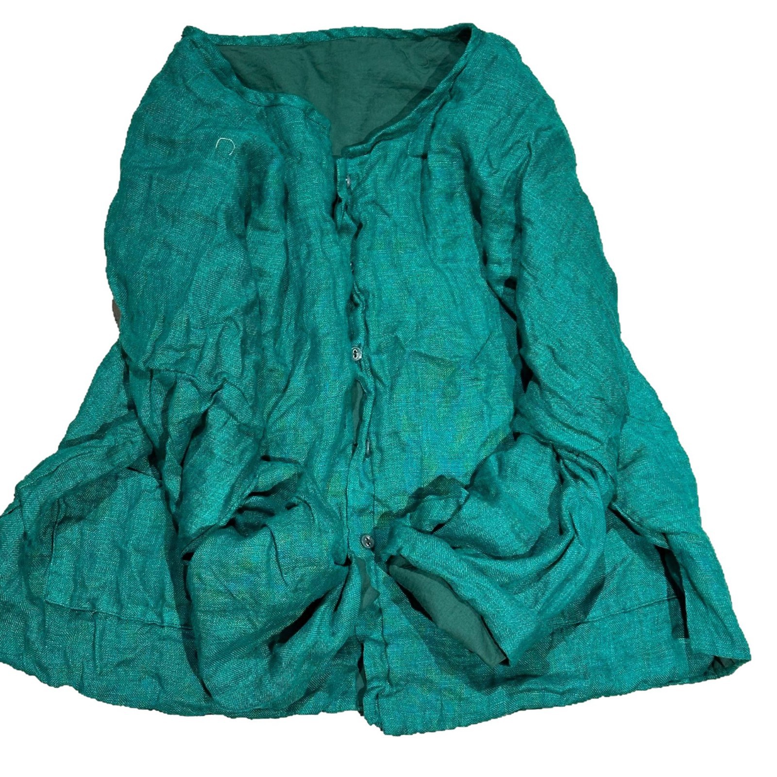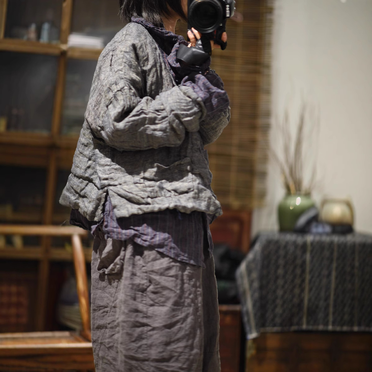 素年未央开叉原创设计新休闲宽松文艺色织亚麻双层复古女开衫外套