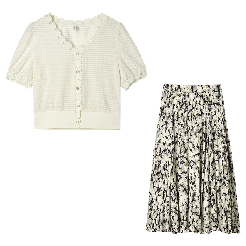 2025年夏装Outlets专柜 QH系列花边V领五分袖上衣+碎花裙两件套装