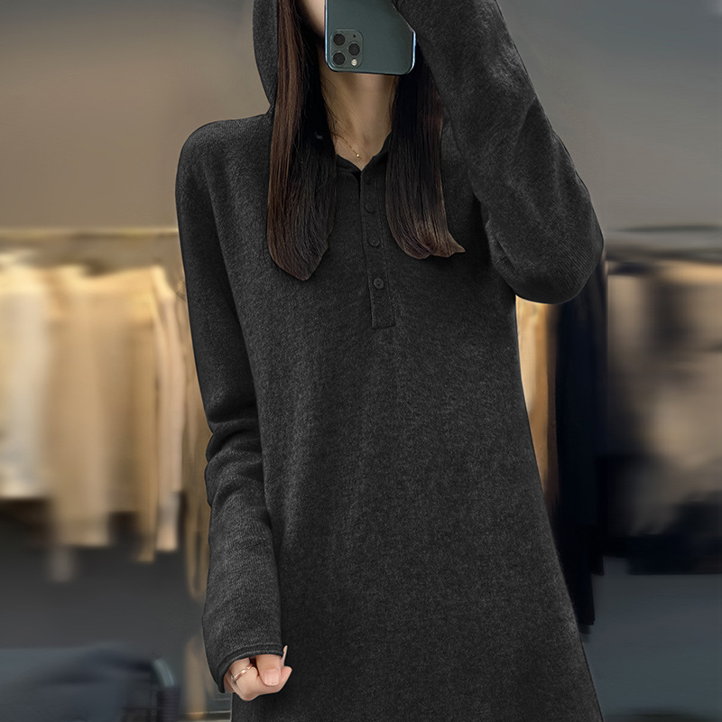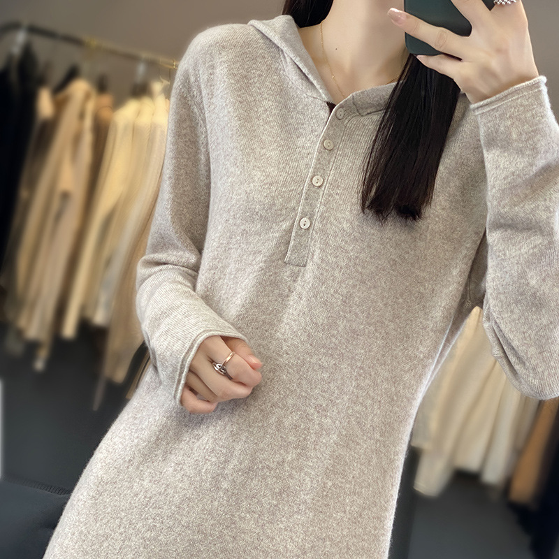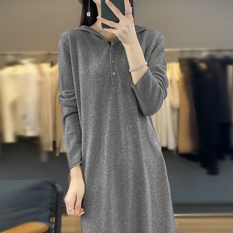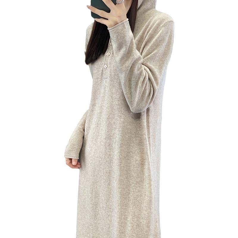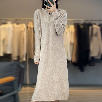 跨境连帽针织连衣裙女2025宽松显瘦中长款过膝毛衣裙休闲直筒