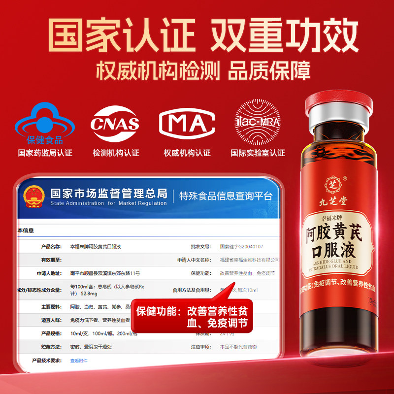 九芝堂阿胶黄芪补血口服液女士补气血养血调理女人贫血气血不足饮