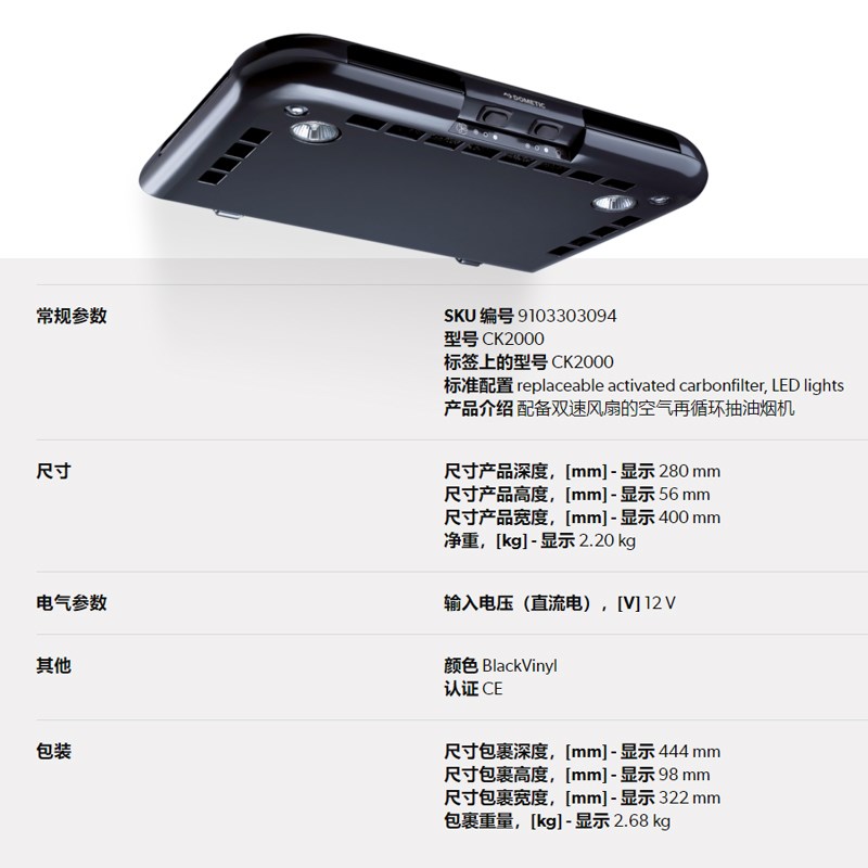 原装进口DOMETIC多美达内循环过滤式房车特种车拖挂 油烟机CK2000