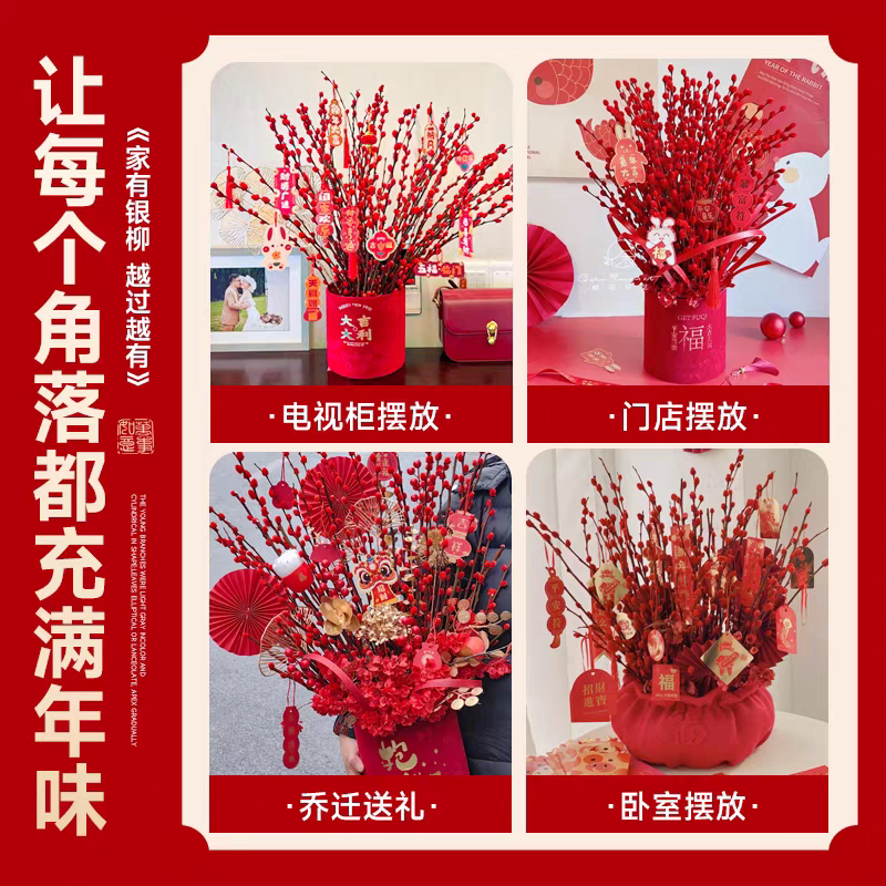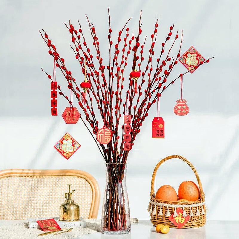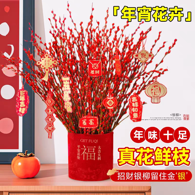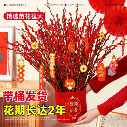 红色银柳真花鲜枝干花花束客厅摆件抱抱桶福桶鲜花年宵花花卉绿植