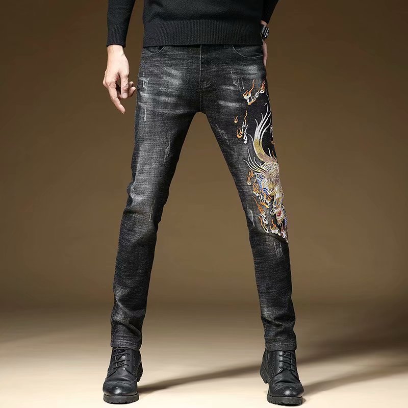 高端刺绣牛仔裤男春秋新款小脚裤
