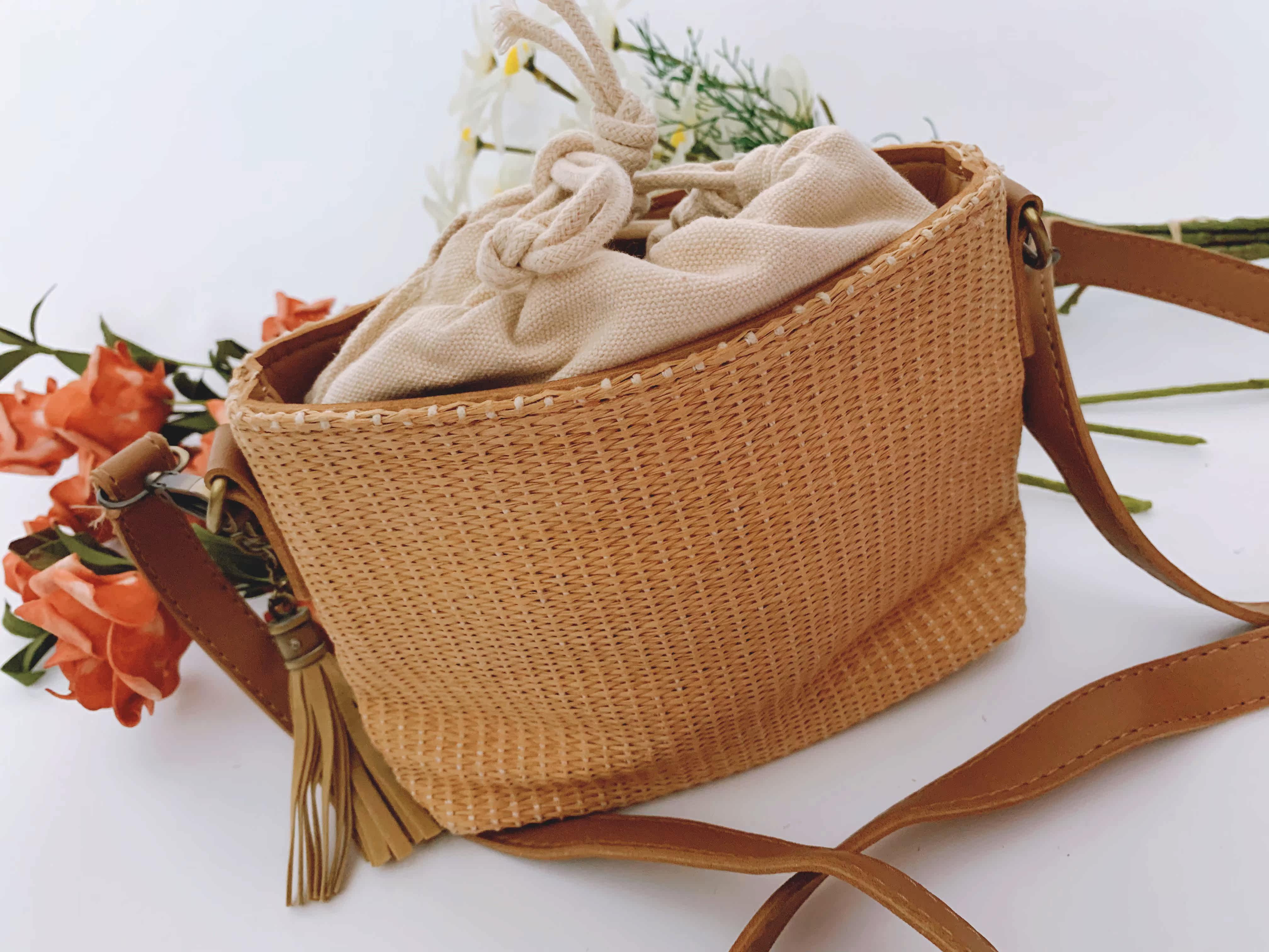 网红ins韩版潮搭编织水桶斜跨单肩包海边度假田园旅拍