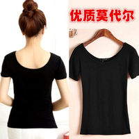 莫代尔短袖t恤女双U大圆领大码上衣黑低领露背瑜伽广场舞蹈练功服
