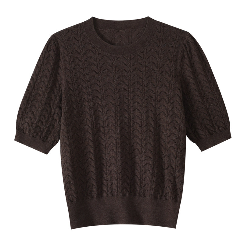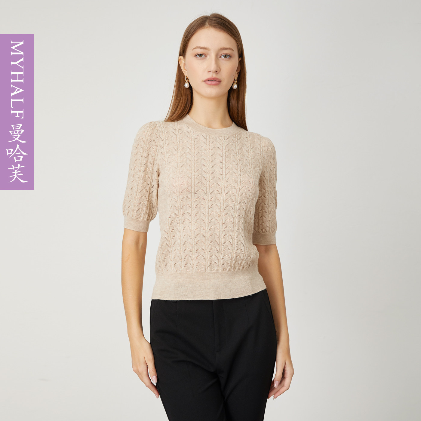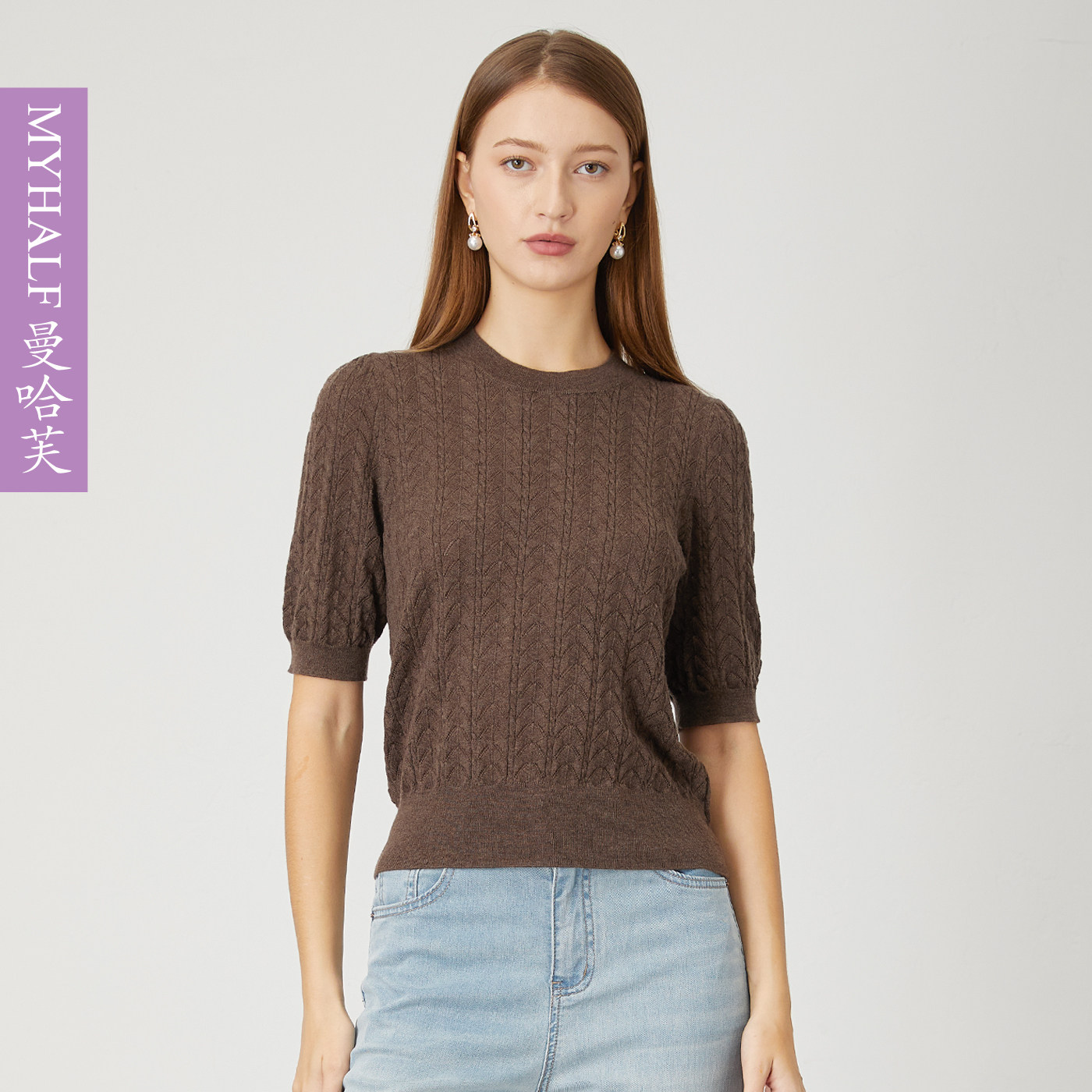 曼哈芙专柜正品肌理纹100%羊毛中袖套头针织衫女气质轻奢上衣毛衣