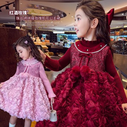 女童加绒礼服公主裙冬装2025新款亮片玫瑰剪花背心连衣裙毛衣套装