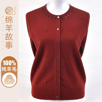 时尚妈妈秋冬洋气100纯羊毛衫外套女中老年大码针织毛衣开衫衣服
