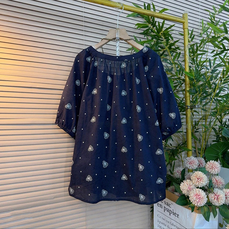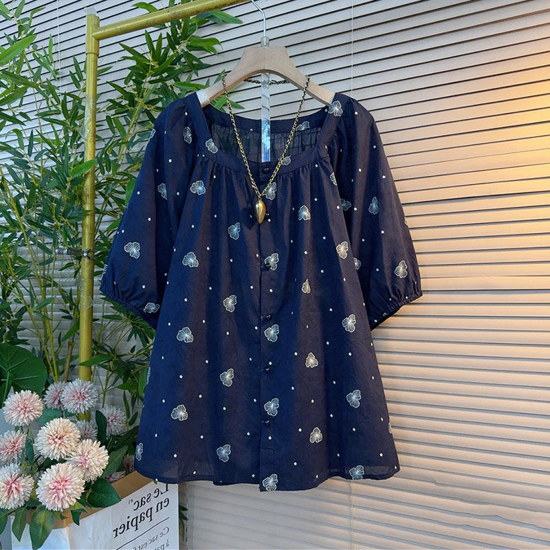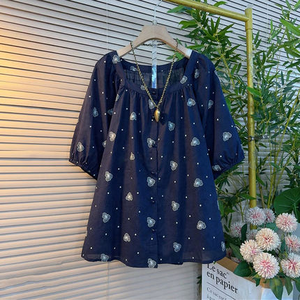 大码女装圆领短袖花朵小衫
