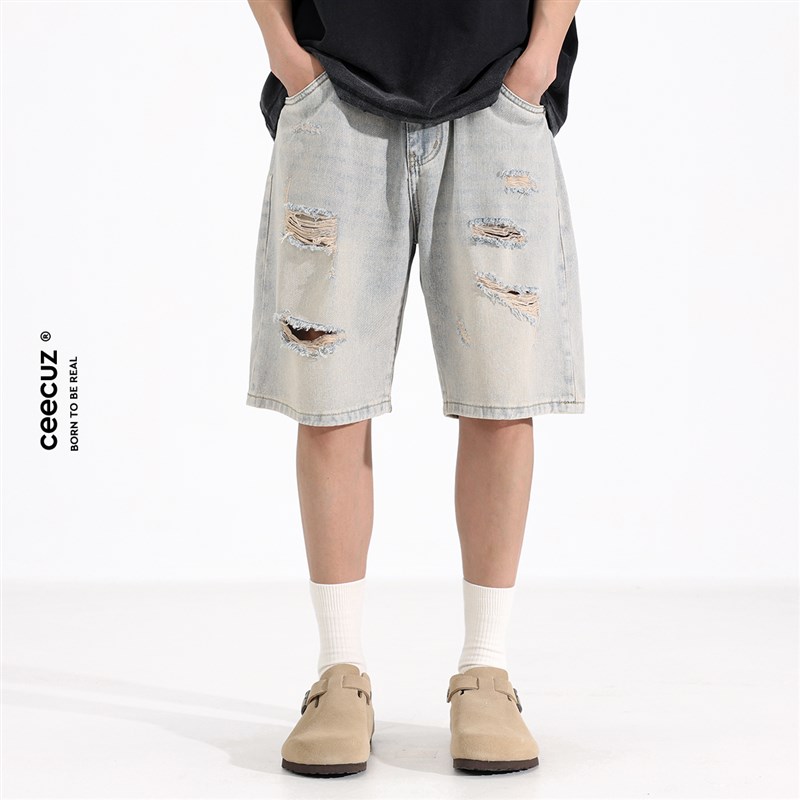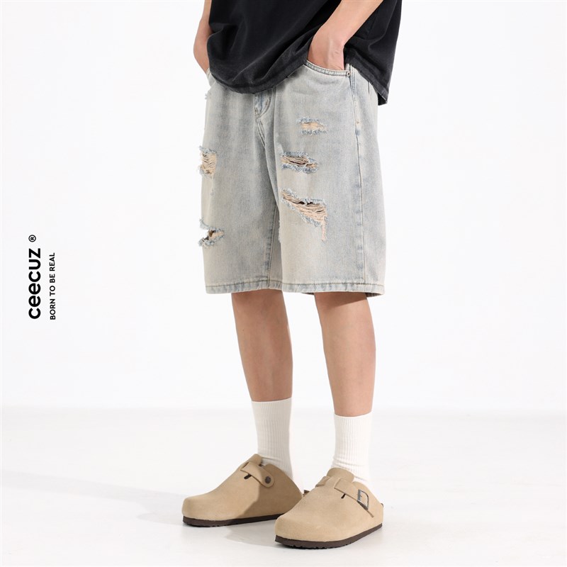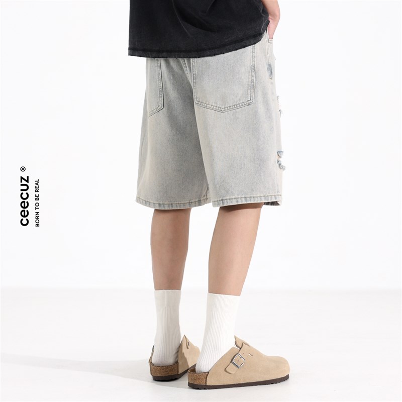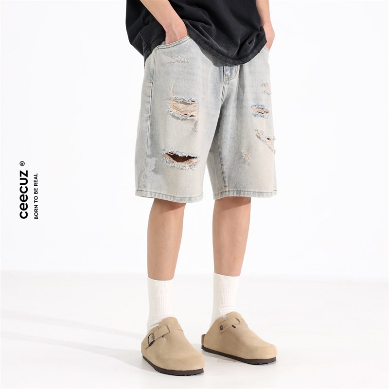 Ceecuz破洞牛仔短裤男款夏薄款美式水洗做旧直筒休宽松阔腿五分裤