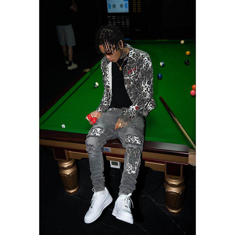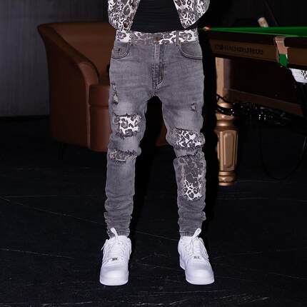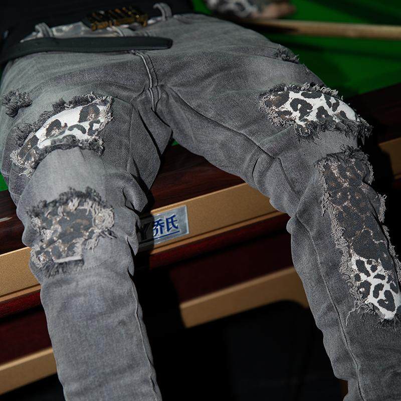 TGFCLUB 美式街头嘻哈RAPPER基础贴布豹纹修身小脚水洗牛仔裤