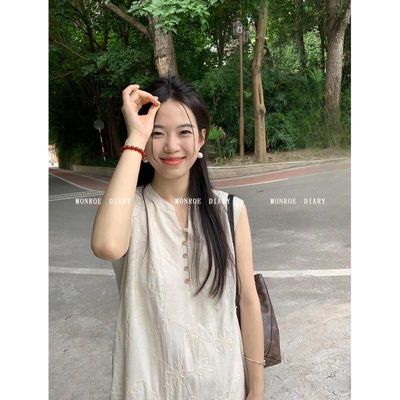 设计感宽松亚麻立体绣花连衣裙女夏季新中式气质背心裙无袖长裙子