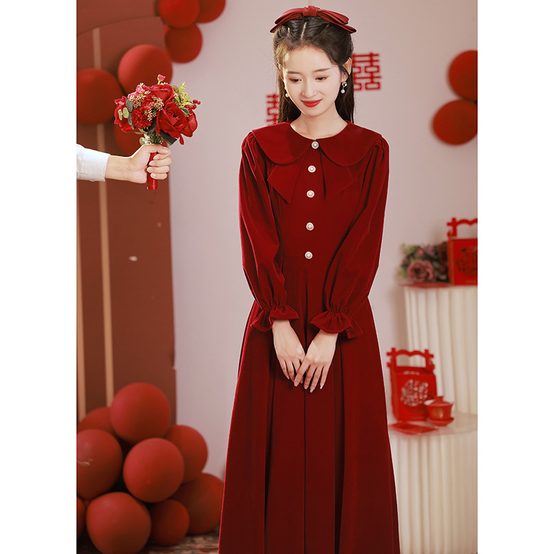 敬酒服新娘丝绒2025新款订婚回门红色礼服裙女冬季长袖秋冬小个子