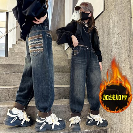 女童加绒裤子秋冬装2025新款儿童冬季加厚一体绒牛仔裤大童老爹裤