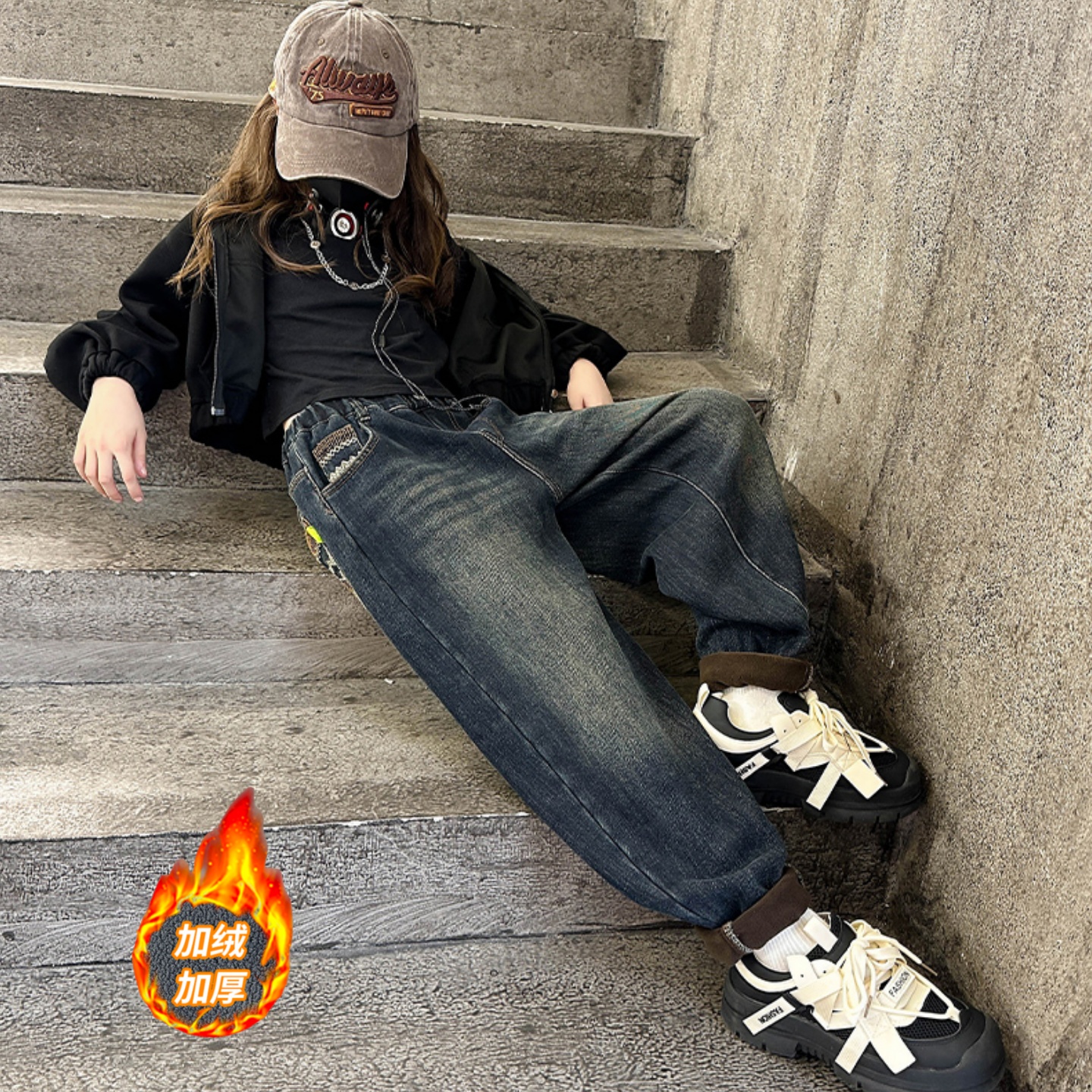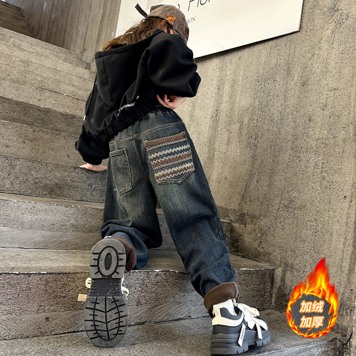 女童加绒加厚休闲牛仔老爹裤