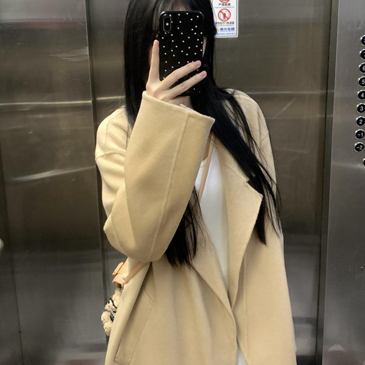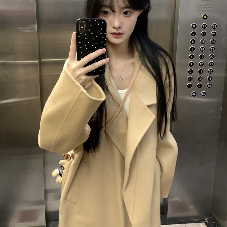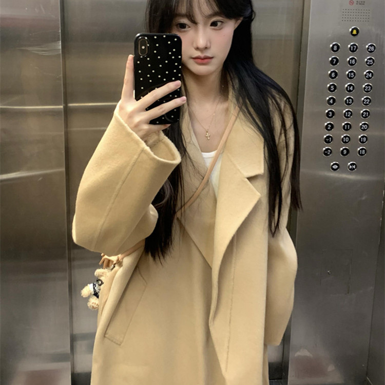 韩系高级感翻领双面呢子大衣女小个子冬季慵懒宽松中长款毛呢外套