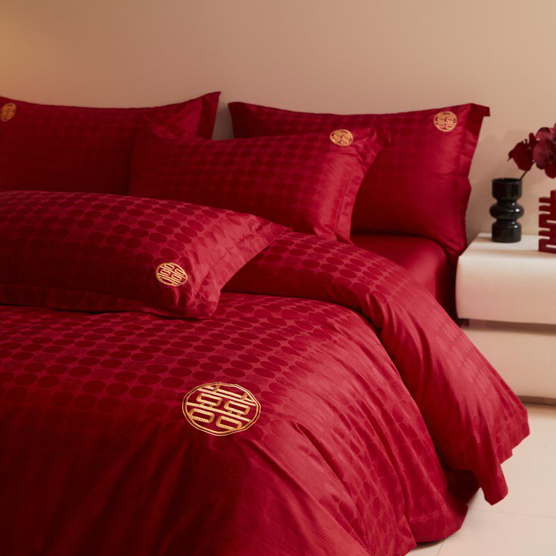 提花结婚四件套婚庆大红刺绣床单被套全棉新婚房婚嫁喜被