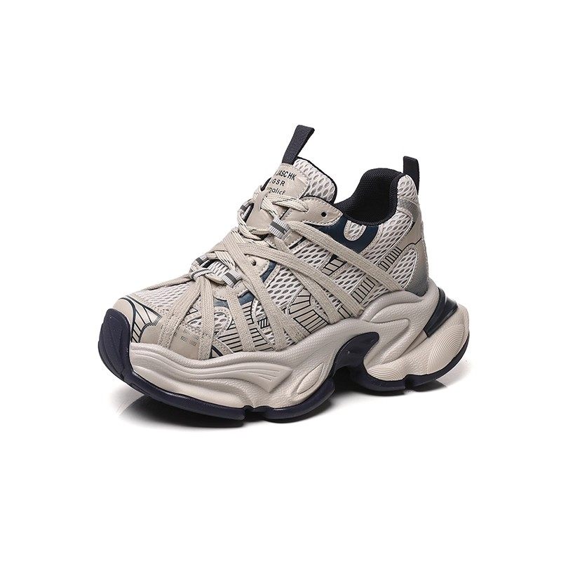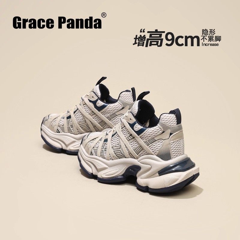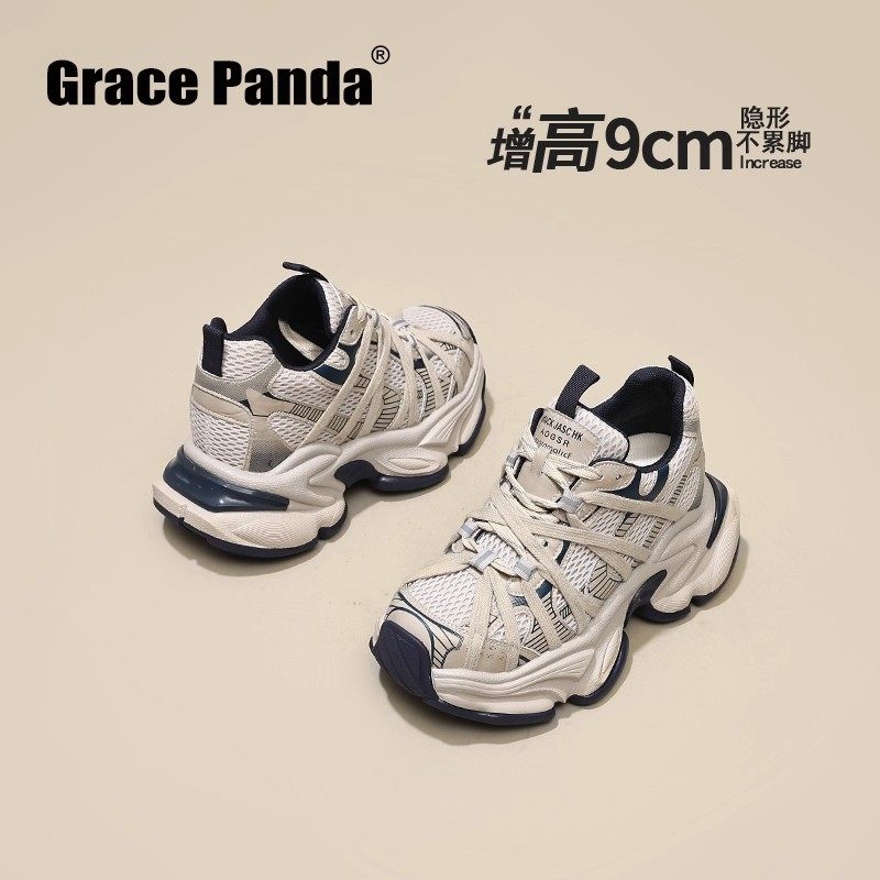 香港2025新款网面厚底内增高9CM灰色软底跑步运动绑带老爹鞋女秋