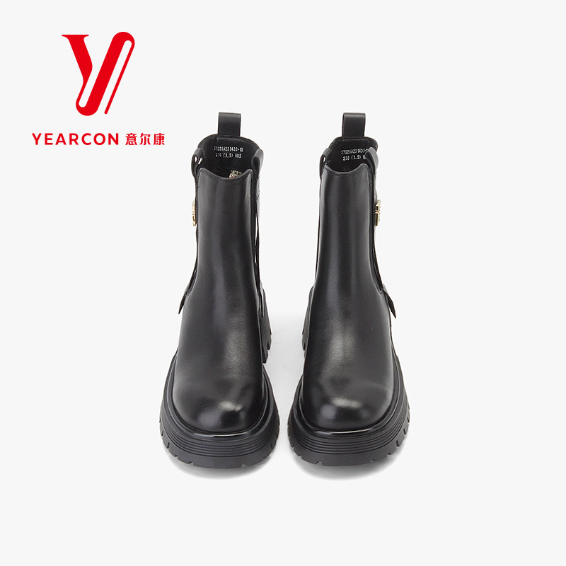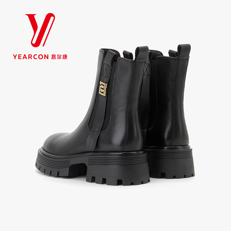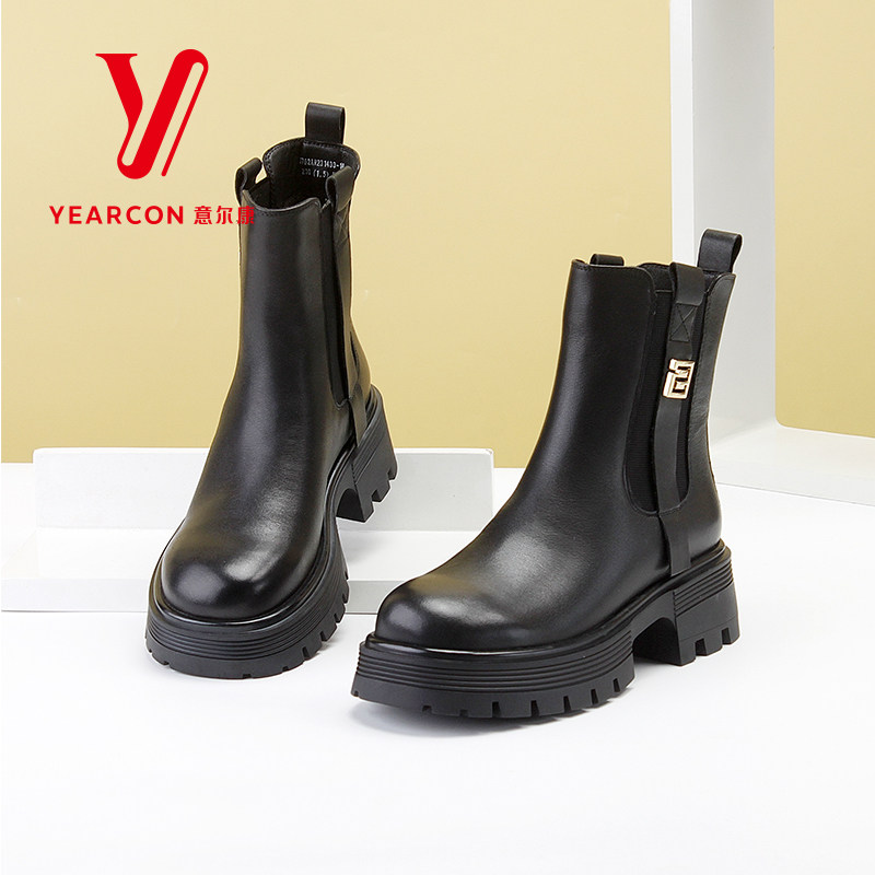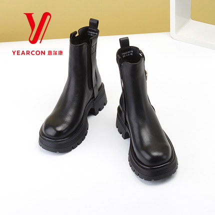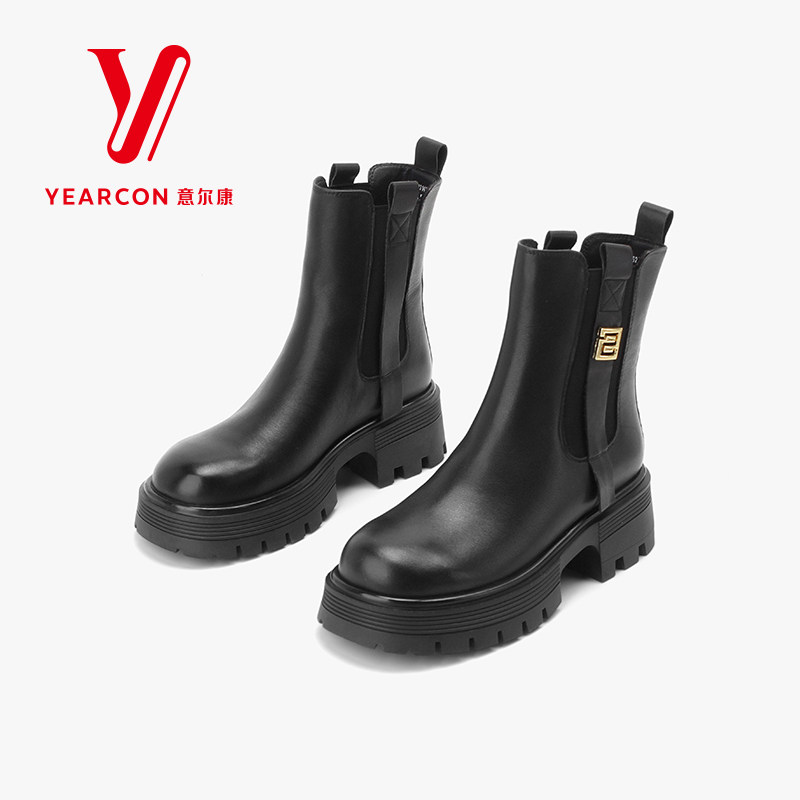 意尔康女靴2024新款冬季加绒烟筒靴女真皮厚底切尔西短靴时装靴子