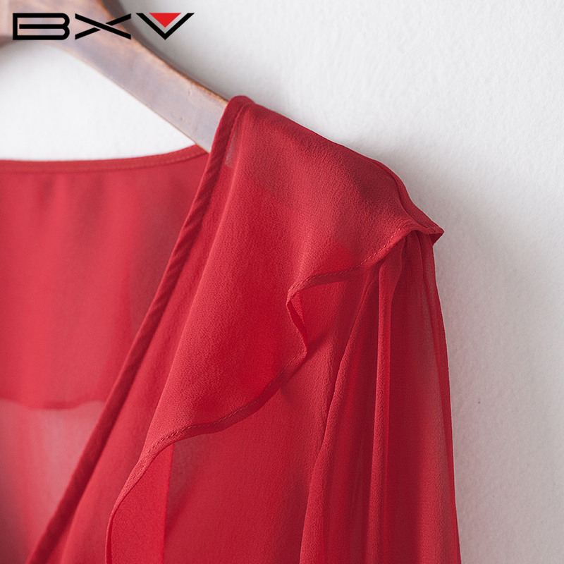 BXV红色真丝开衫女2025春夏新款长袖空调衫薄款桑蚕丝防晒罩衫潮