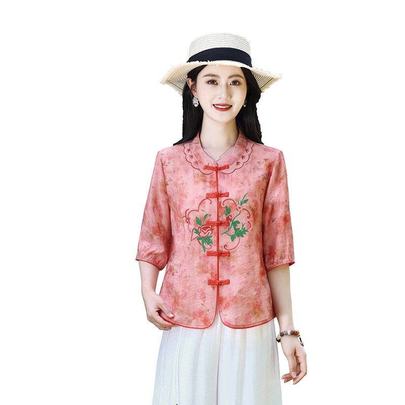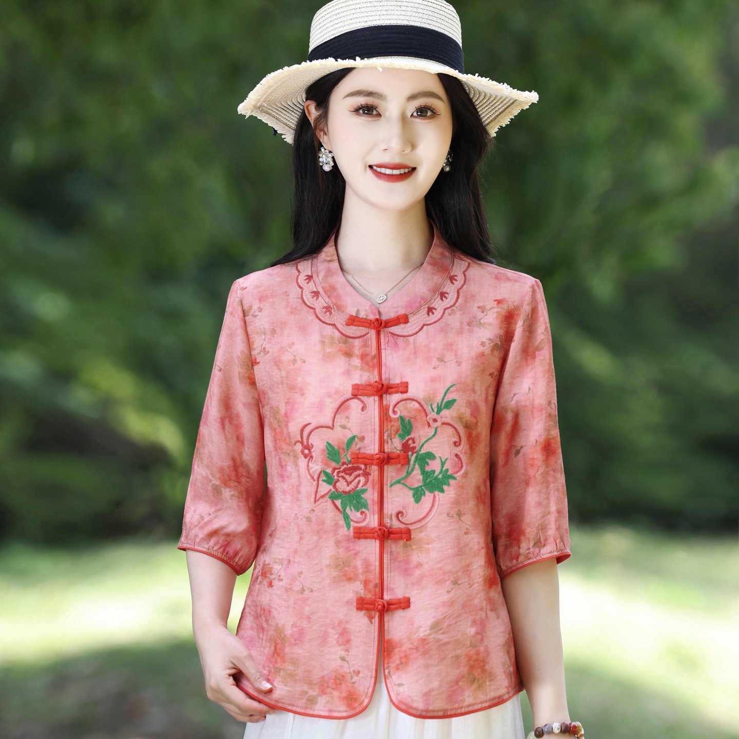 中年女夏季新款刺绣衬衫套装年轻妈妈天丝棉麻复古宽松五分袖衬衣