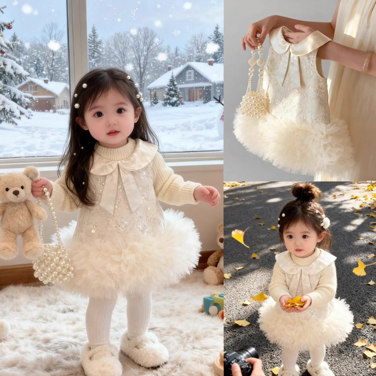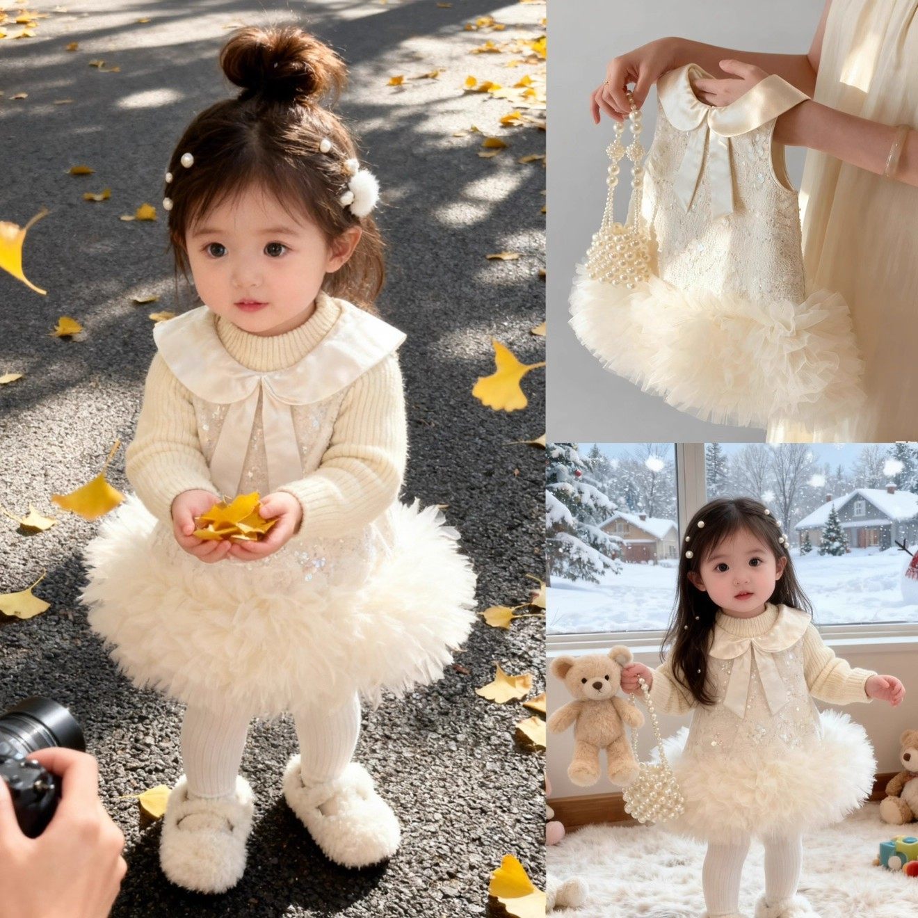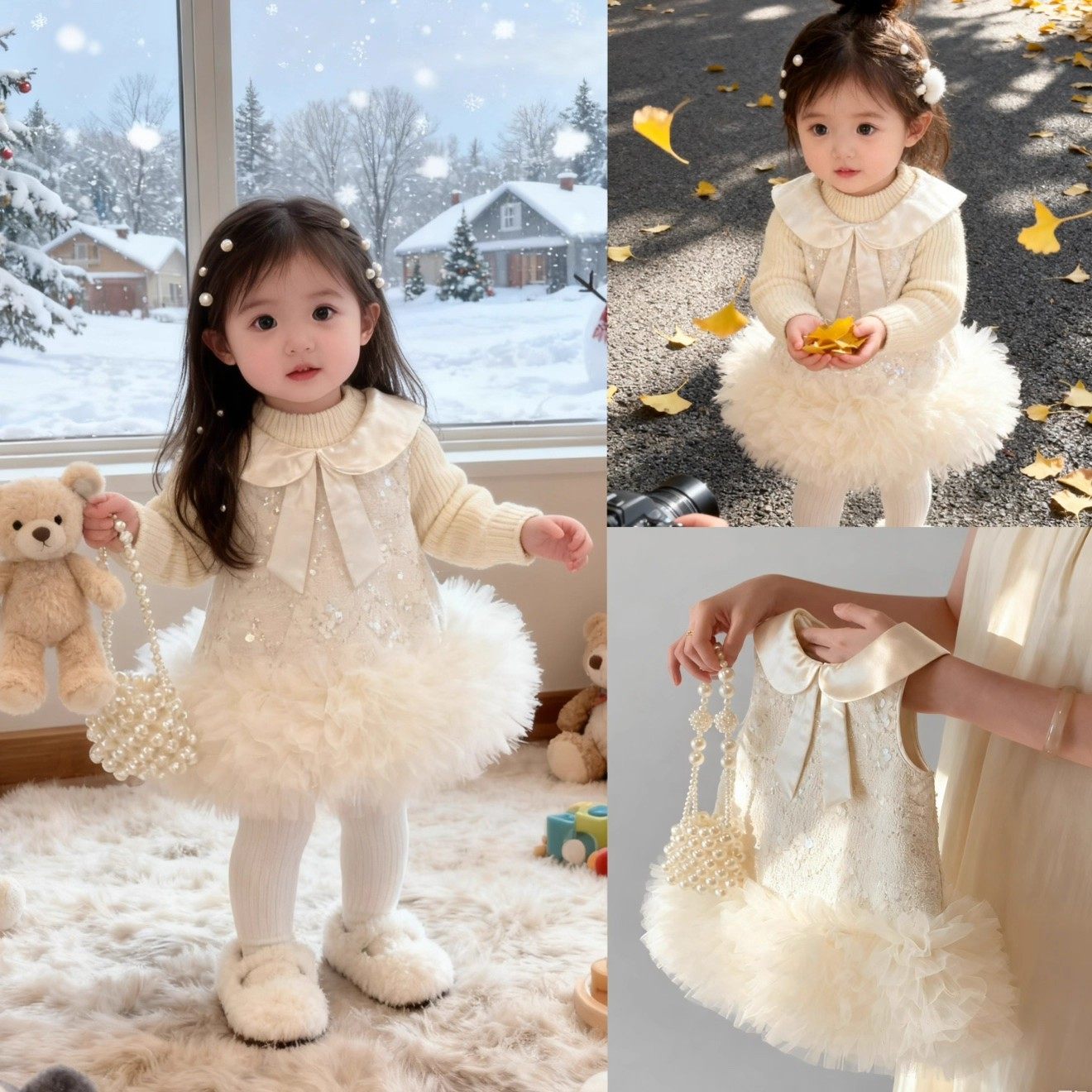 高端女童小香风连衣裙秋冬娃娃领周岁生日公主裙蝴蝶结礼服蓬蓬裙