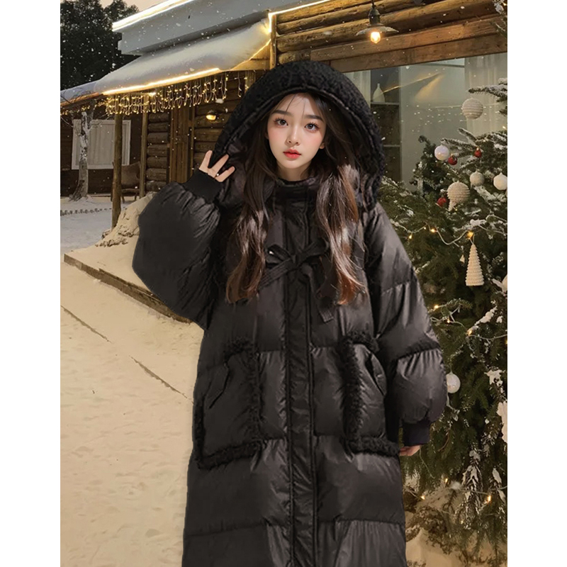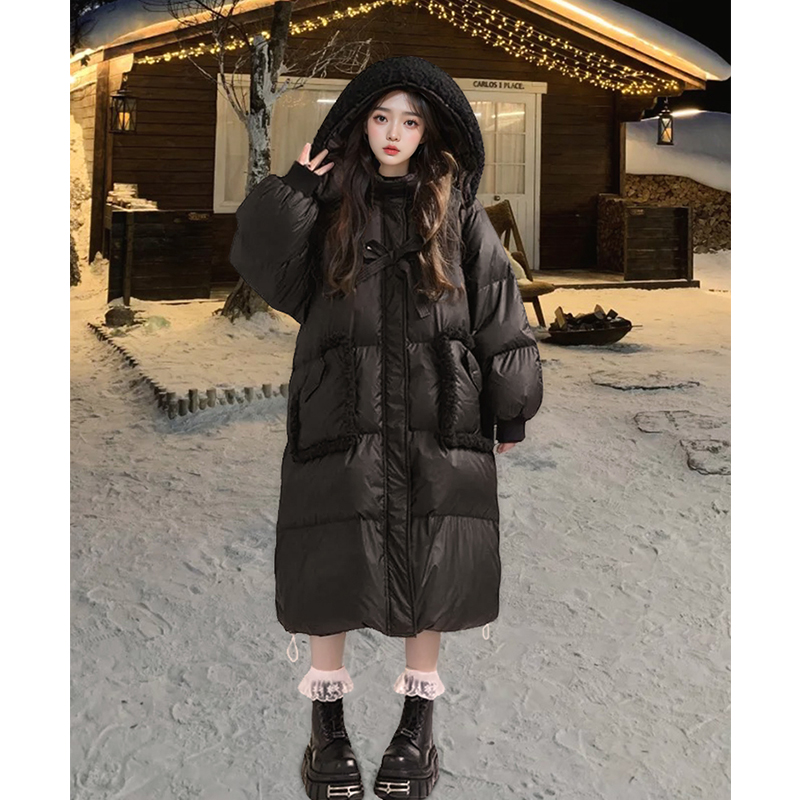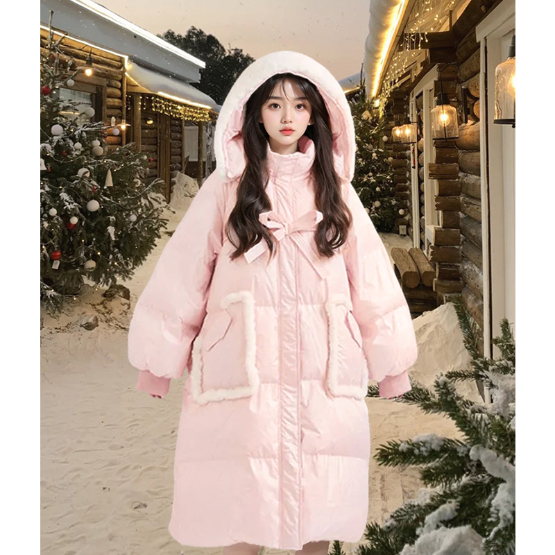 粉色蝴蝶结可爱减龄宽松气质中长款棉服外套女冬季
