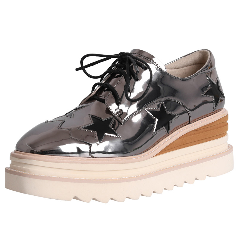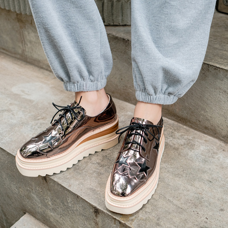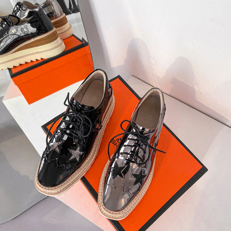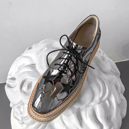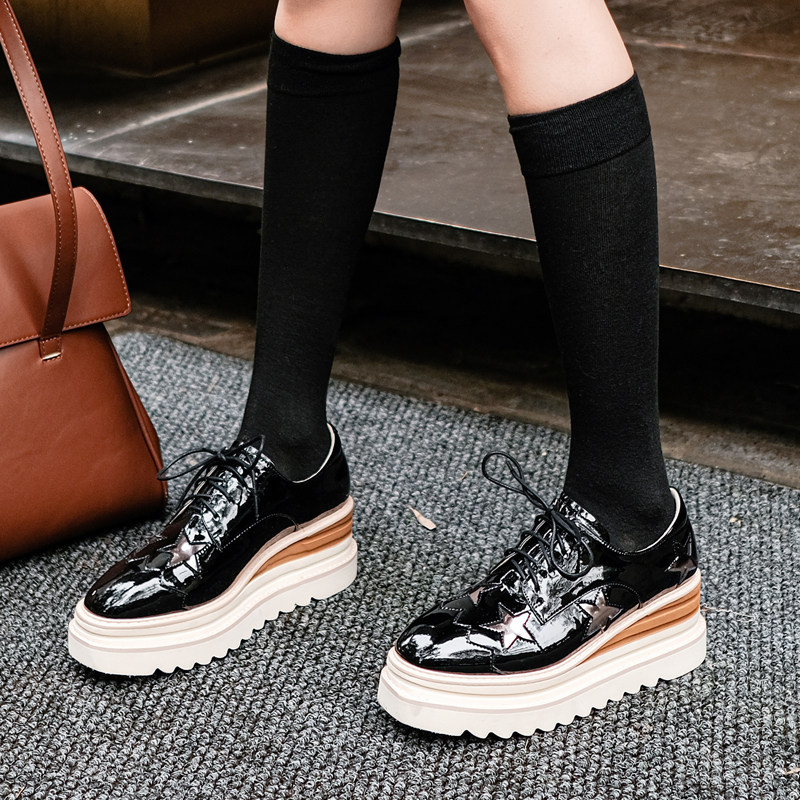 2025春秋新款松糕鞋女厚底增高坡跟单鞋英伦风系带星星方头休闲鞋