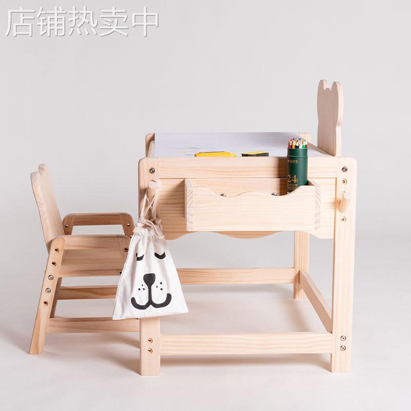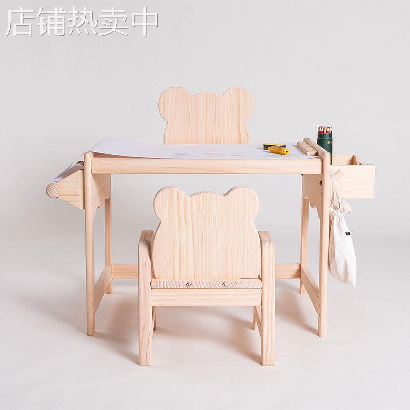 全实木儿童房画画学习桌创意多功能熊桌椅可升降高度松木课桌椅
