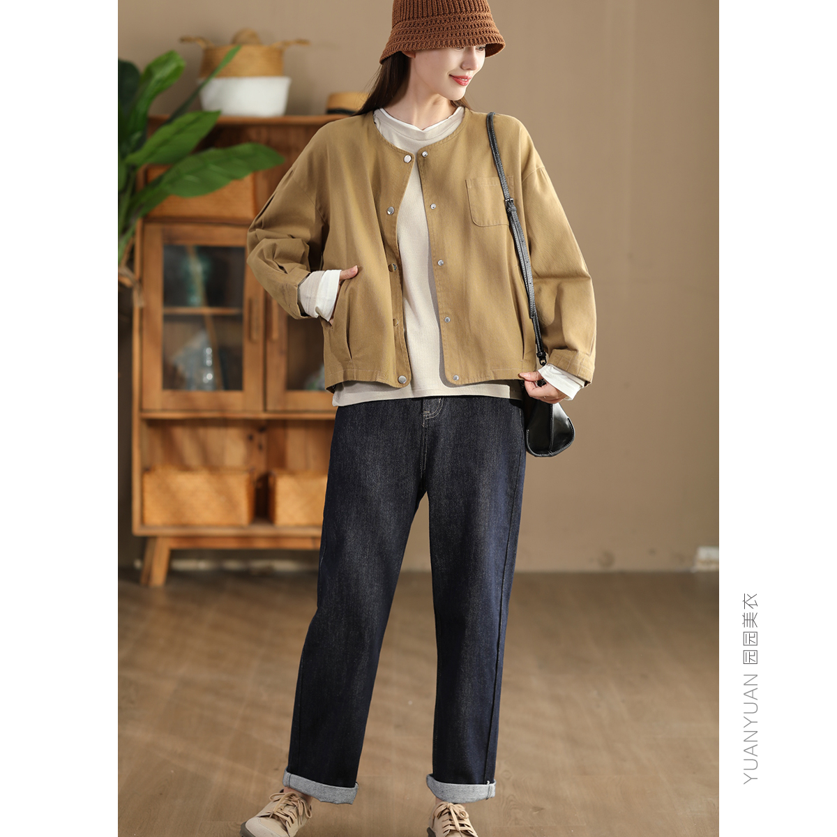 秋款复古100%棉挺括外套女内里格纹短款风衣宽松圆领开衫夹克外搭