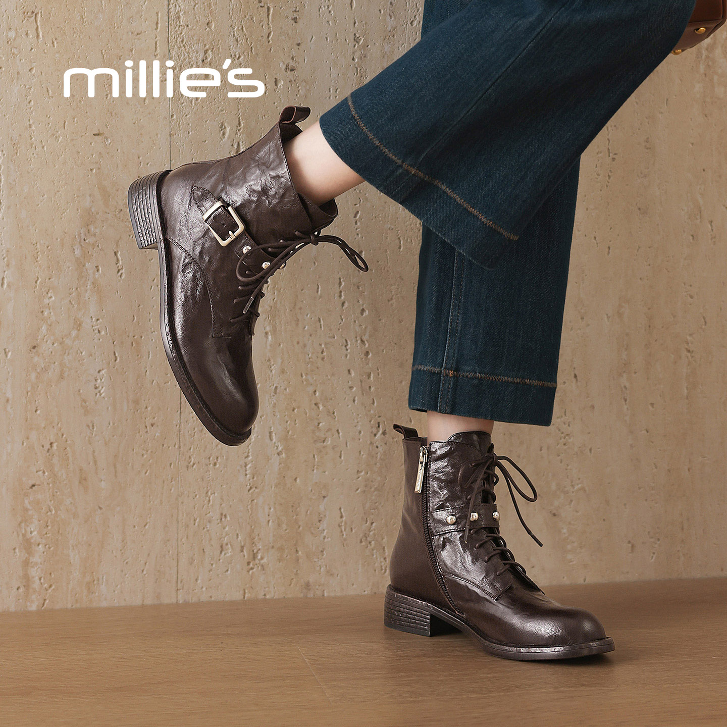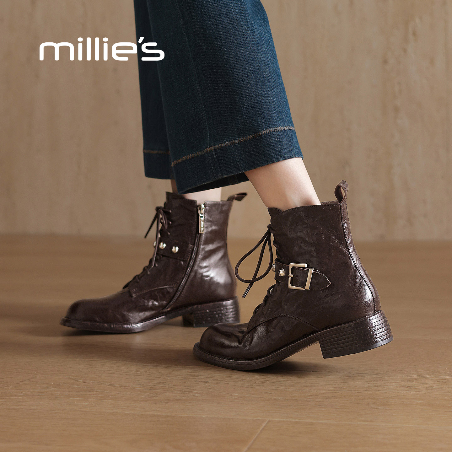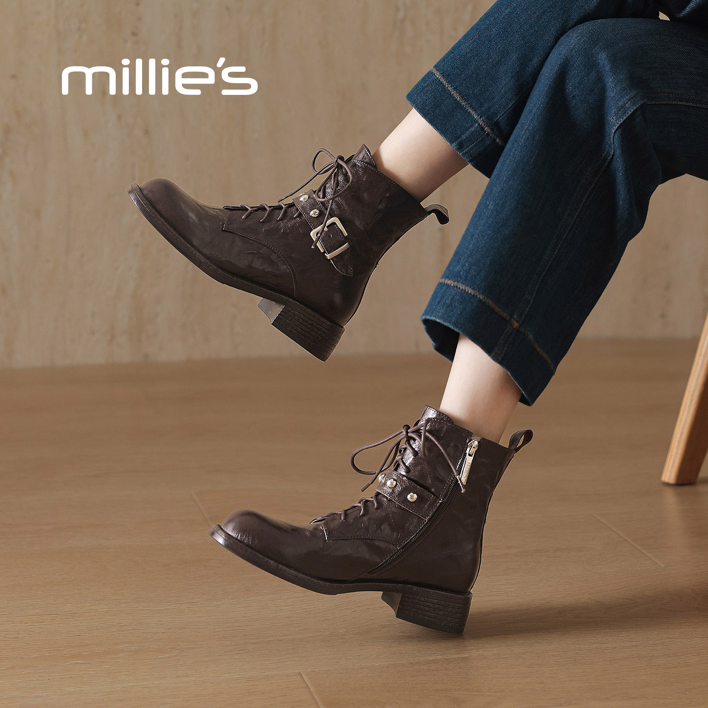 MILLIE'S/妙丽真皮厚底马丁靴女2025新款英伦风短靴系带高跟靴子