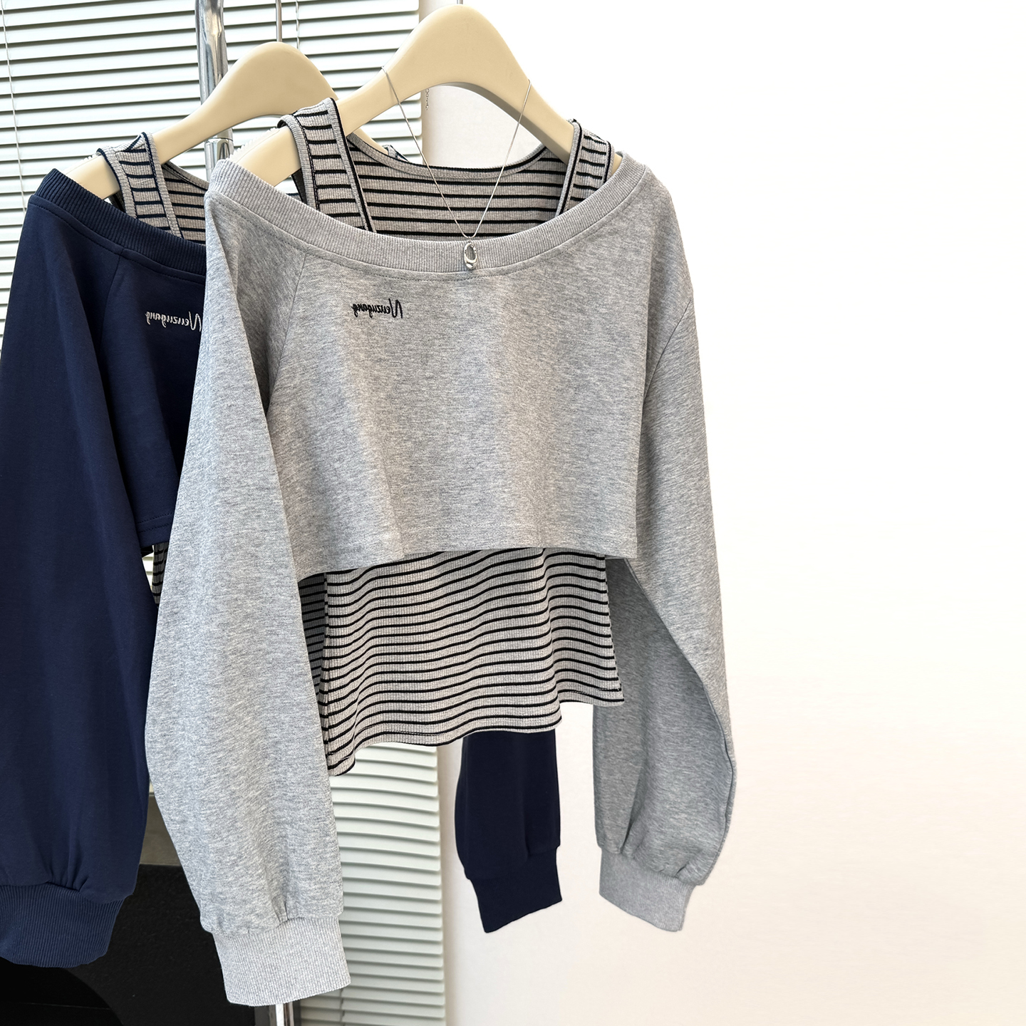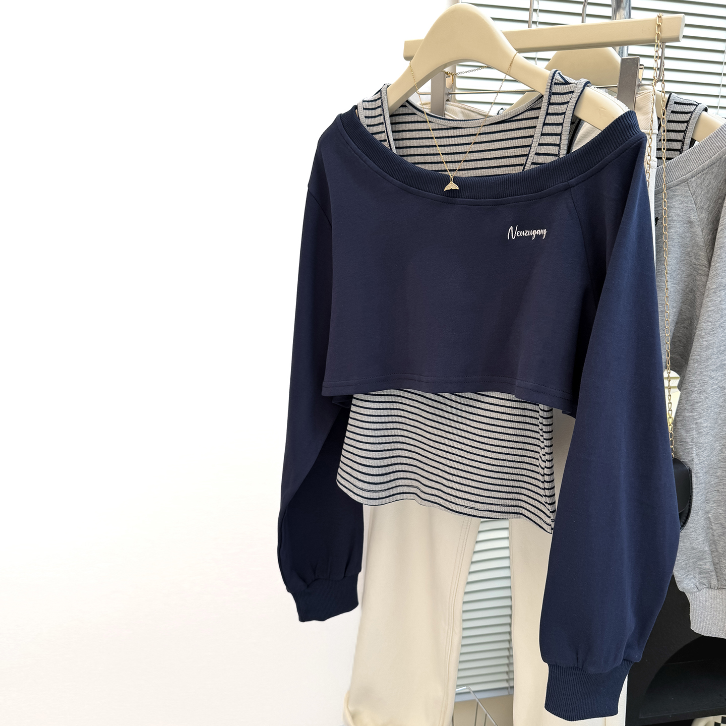 斜露肩不规则字母刺绣长袖短款卫衣女秋季内搭条纹吊带两件套上衣