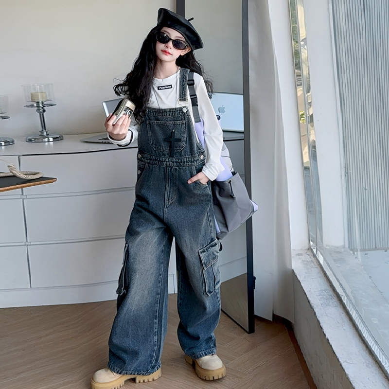 女童2025秋季新款美式复古时尚休闲牛仔背带裤直筒裤宽松工装风潮