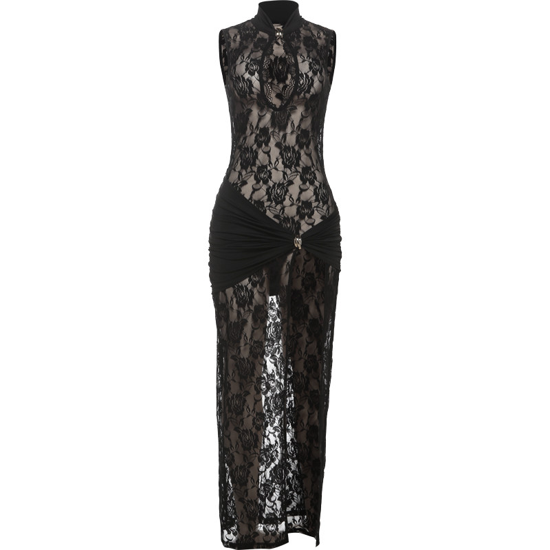 SylCue 欧美辣妹ins风黑色蕾丝透视性感镂空无袖连衣裙开叉包臀裙