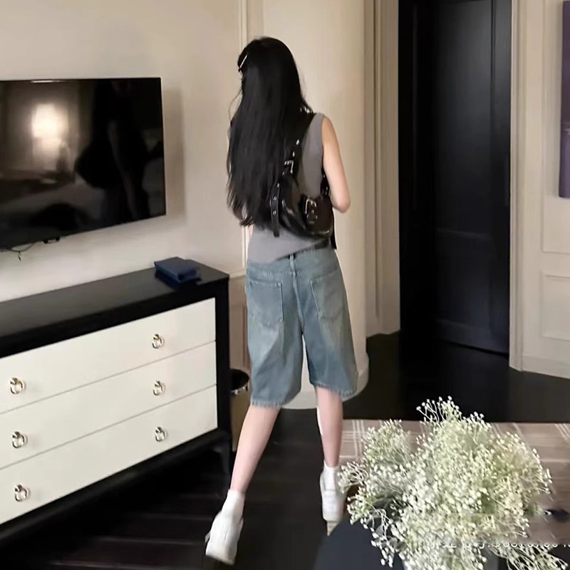 怀旧五分牛仔短裤女2025年夏季新款韩版高腰宽松直筒阔腿中裤百搭