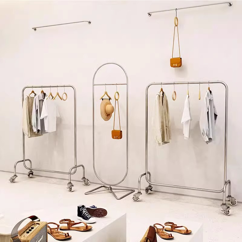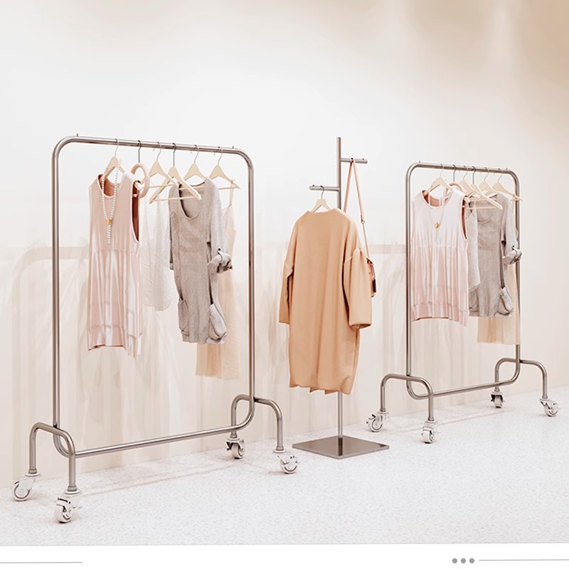 服装店展示架女装店不锈钢货架衣服架子落地式移动挂衣杆银色带轮