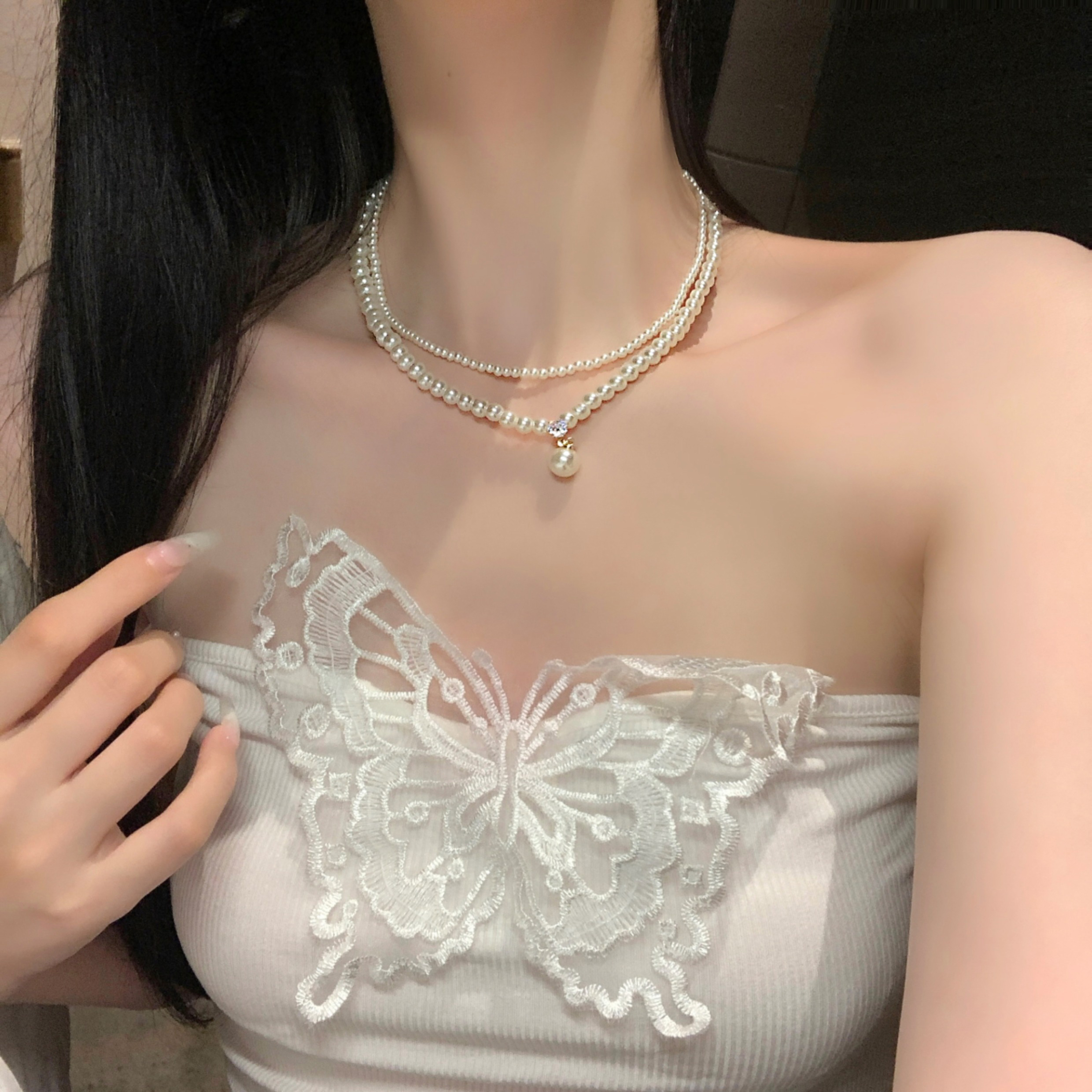 法式复古双层珍珠闪钻项链高级感轻奢小米珠锁骨链小众颈链choker