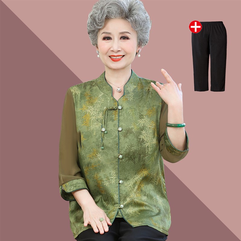 奶奶夏装中国风衬衫中老年人唐装妈妈夏季雪纺上衣女装老人两件套