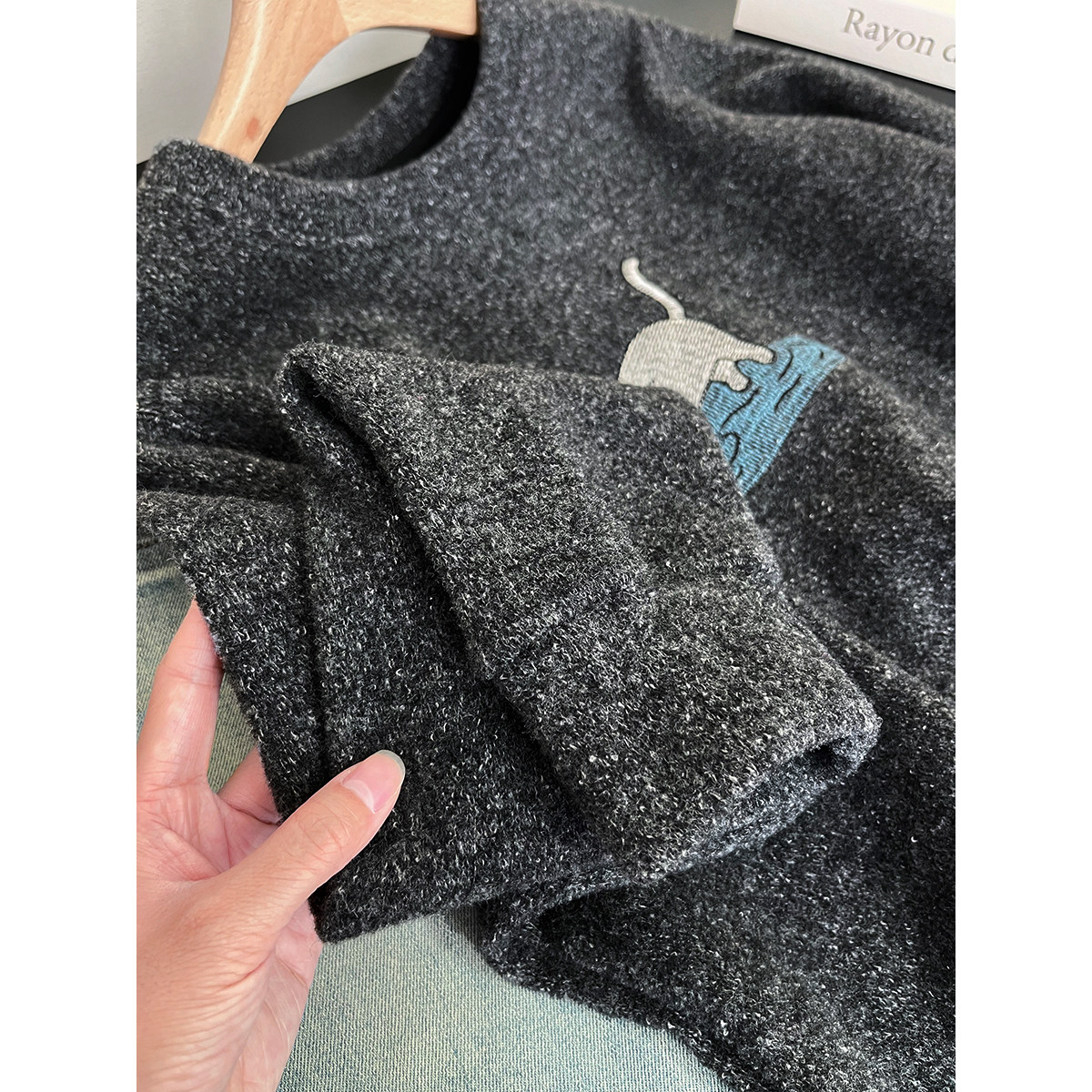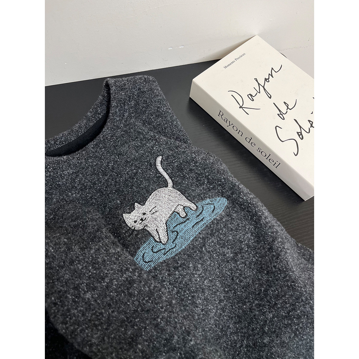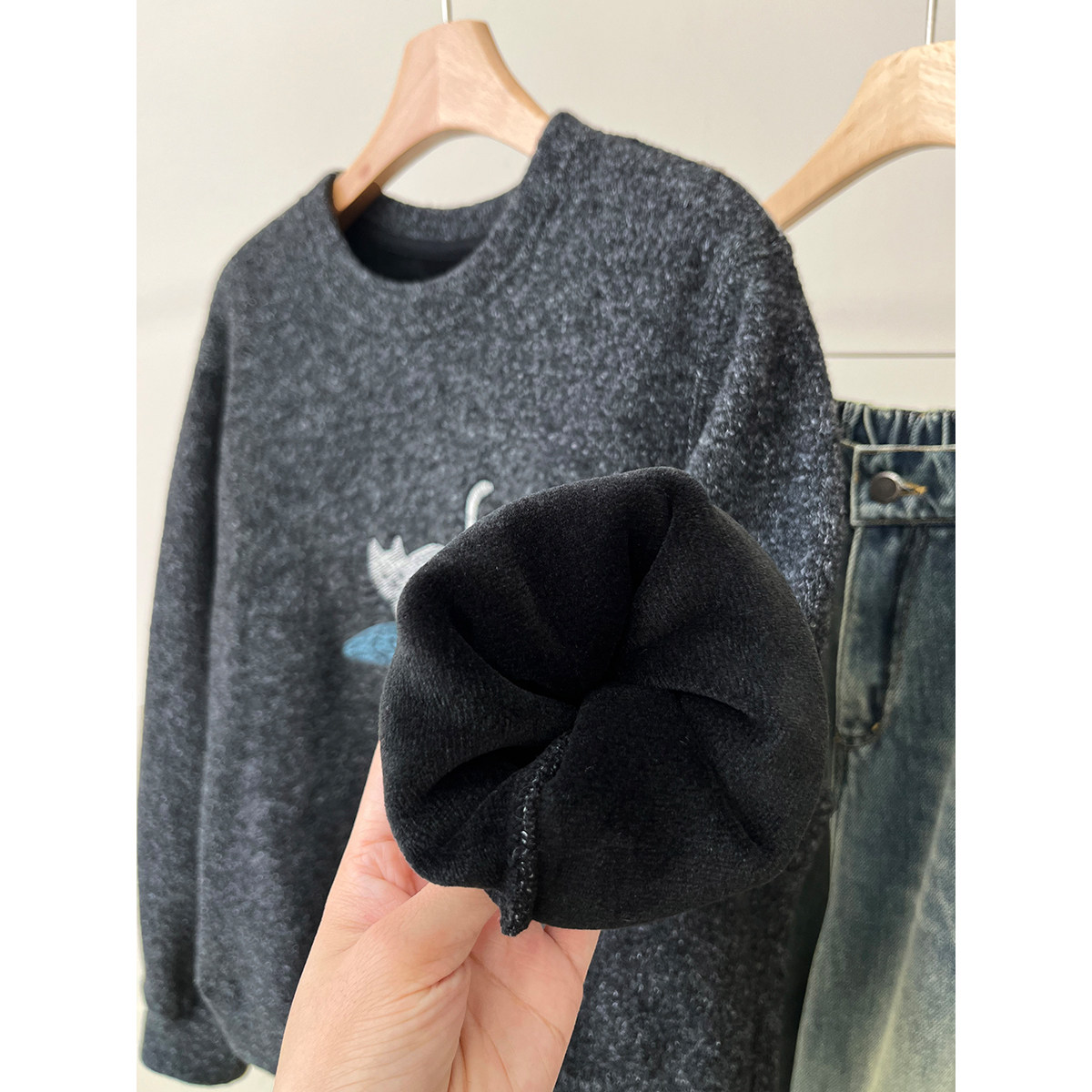 韩版复古刺绣猫咪加绒加厚羊毛卫衣女圆领宽松套头显瘦保暖上衣