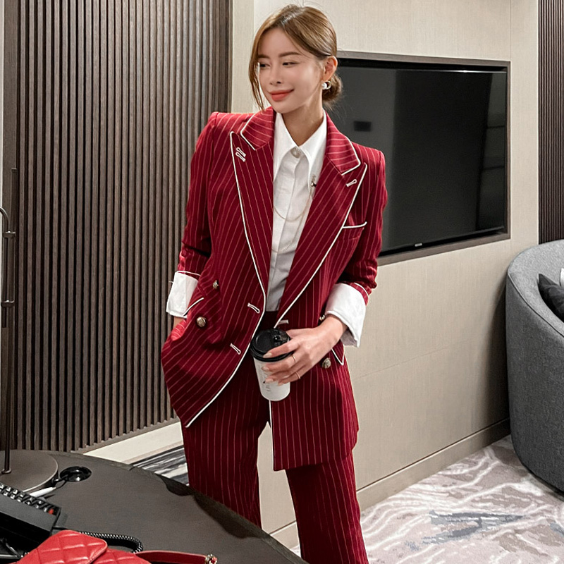 气场强大女装职业套装通勤西装外套秋冬休闲条纹两件套裤装高级感