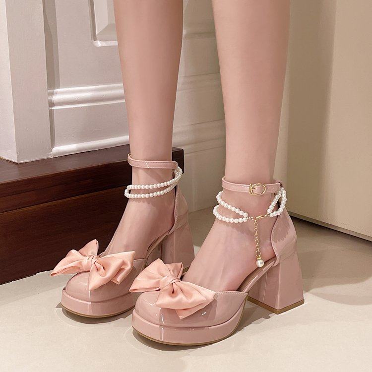 法式粗跟玛丽珍鞋女夏季新款仙女风蝴蝶结珍珠高跟小皮鞋包头凉鞋