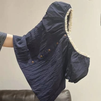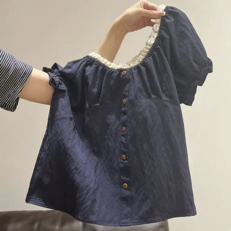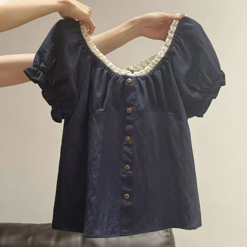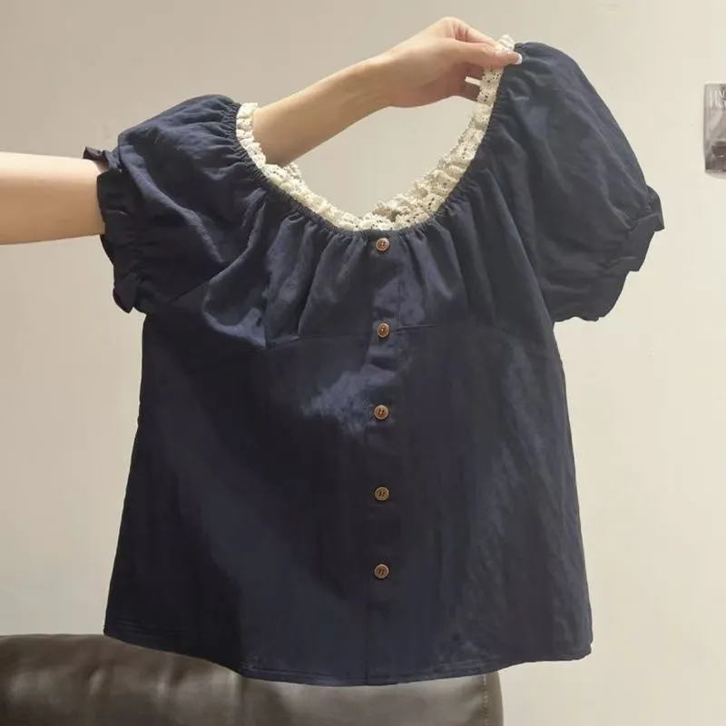 法式蕾丝花边泡泡袖短袖衬衫女夏季2025超火短款雪纺小衫衬衣上衣