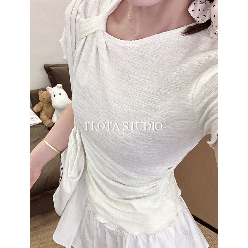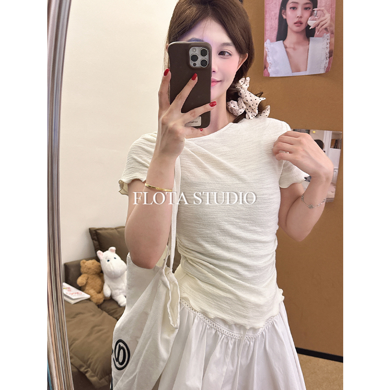 【flota】正肩木耳边斜领短袖T恤女纯色简约收腰修身短款上衣