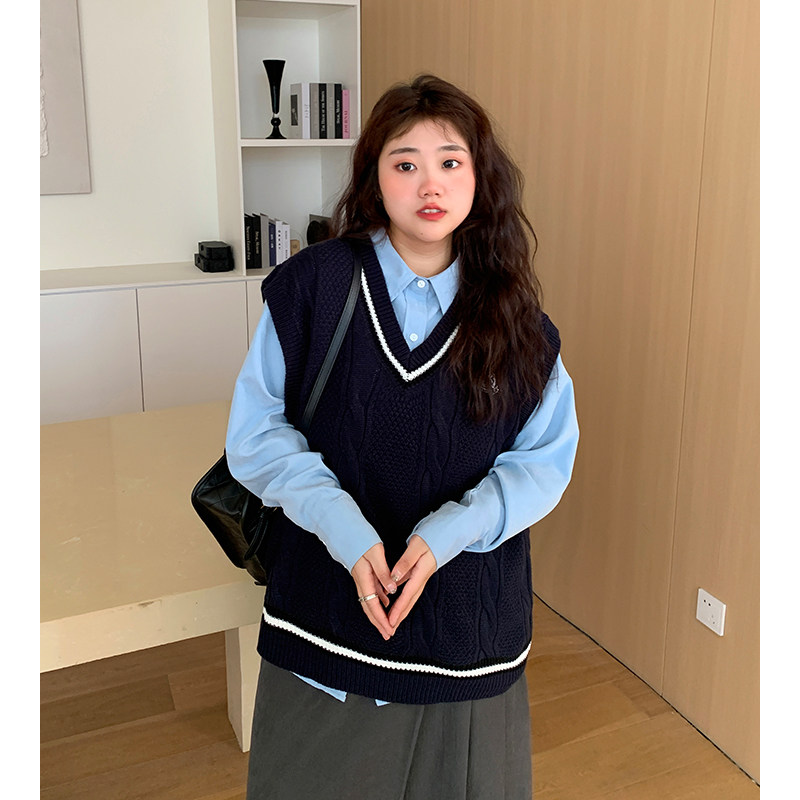 YUZI鱼子上衣V领韩系学院风马甲大码女装微胖mm显瘦遮肉印花马夹