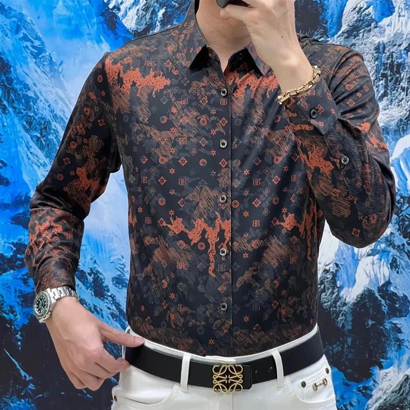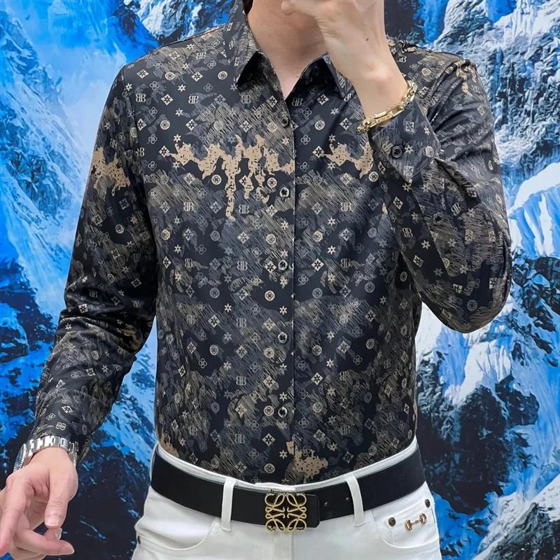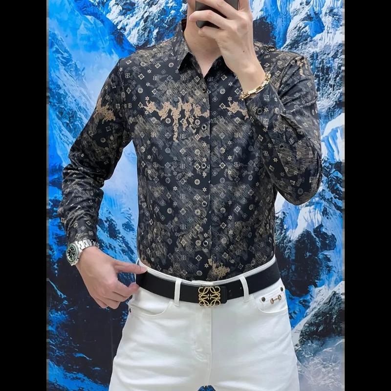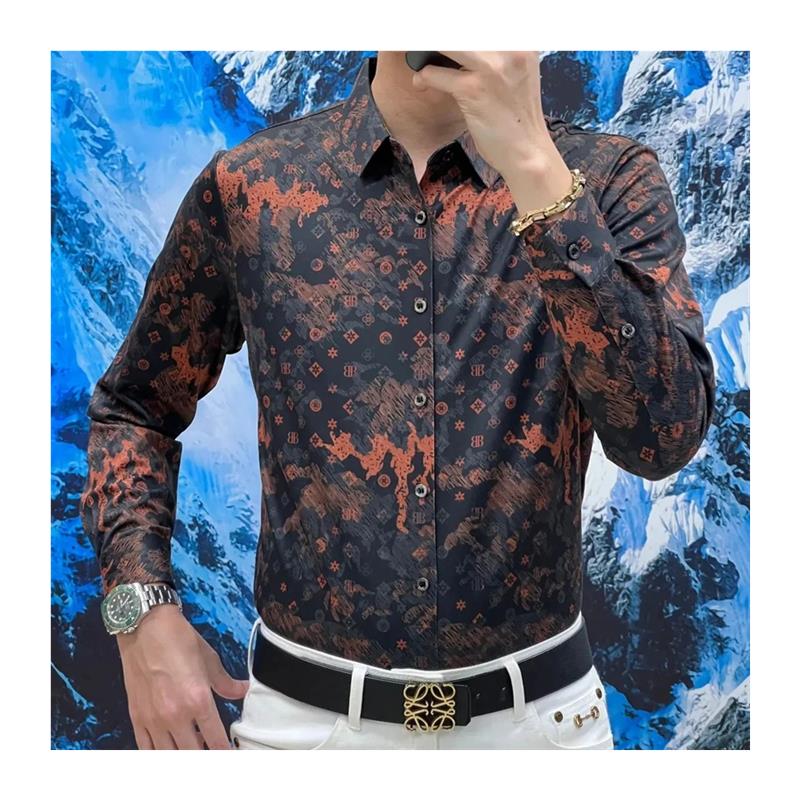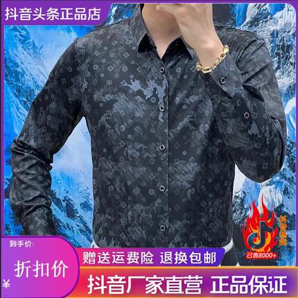 路西威男装男士方领修身秋季印花长袖L衬衫时尚高级感个性痞帅衬
