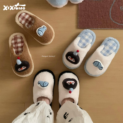 细细条 情侣ins企鹅小鱼冬季家居棉拖鞋舒适防滑保暖男女士毛毛鞋